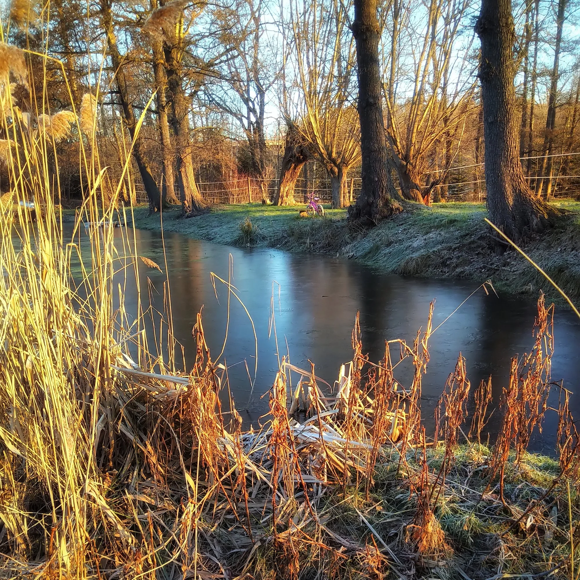 Die Streuobstwiese scheint noch zu schlafen, also nochmal kurz hinunter zum Teich. Kannst Du ihn sehen? Da unten ist er, und tatsächlich, er ist über Nacht gefroren.