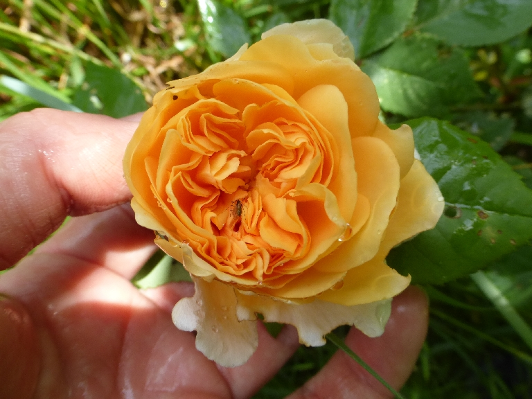 Abraham Darby - hat seine angenagte Blüte doch noch ganz nett aufbekommen, und die Ränder sind sowohl den Raupen als auch dem Regen geschuldet. Isser halt mal originell gefranst. :grins: Franz Darby...