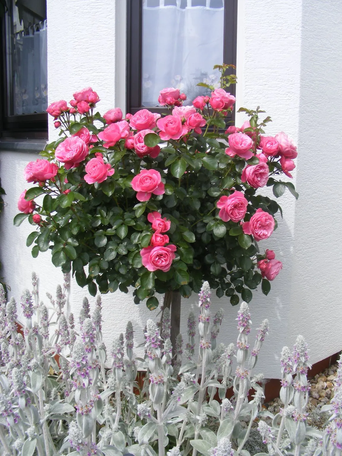 Muß mal später ein Foto von der gesamten Rose machen. Sie ist recht hoch gewachsen. Bin aber froh, daß sie (noch) aufrecht steht. Das kleine Beet ist am Wege zur Terrasse, ich geh dort öfter lang, mußte sie dann also irgendwie stützen.