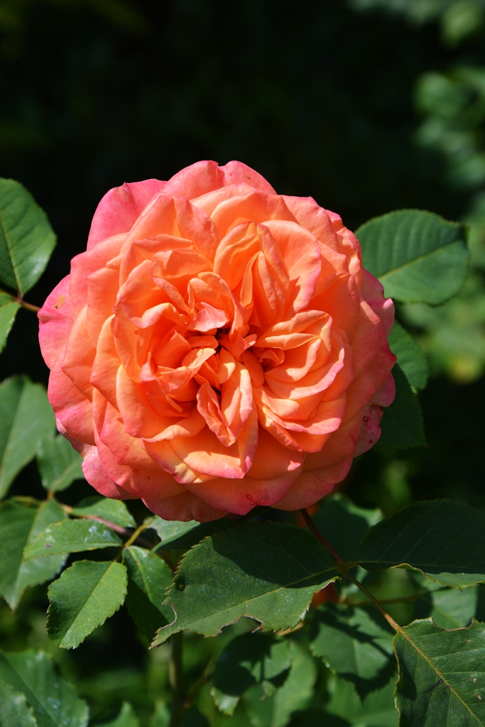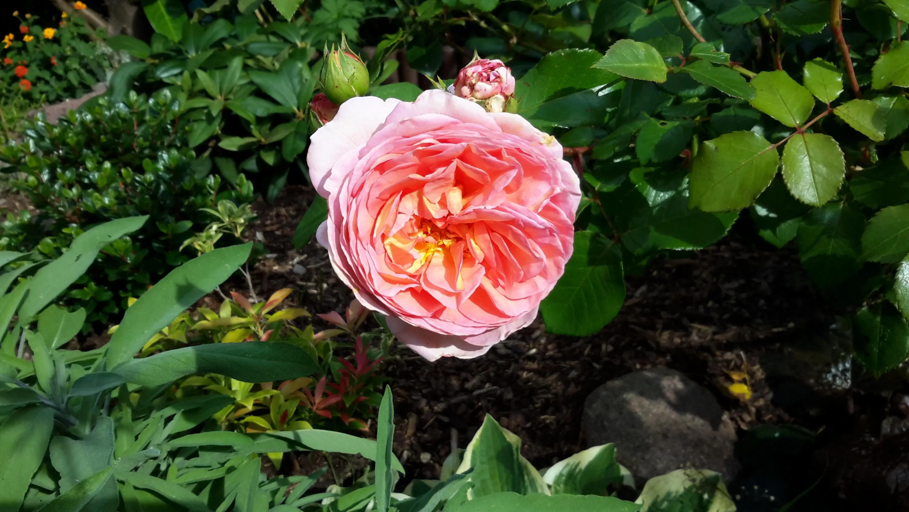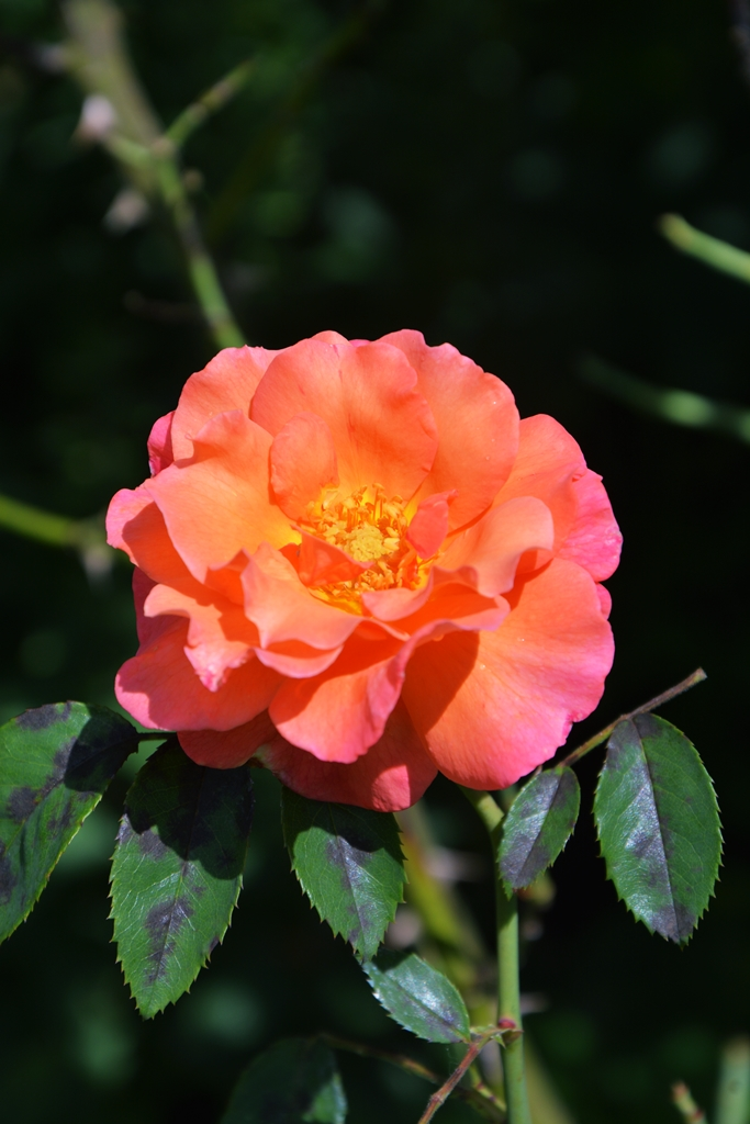 Heidi Klum habe ich ebenfalls von Tantau und ebenfalls als Patio-Variante. Sie steht etwas ungünstig am Hang, unter ihr budeln die Mäuse Löcher, und das Wasser geht ihr flöten, und durch ihre Schräglage kriegt sie eh nie viel Wasser ab. Sie ist daher geschwächt und verpilzt, schickt aber beharrlich neue Triebe. Ich bin beeindruckt von ihrer Hartnäckigkeit. Die Blütenfarbe und -füllung ist super. Und für ihren doofen Namen kann sie nichts.