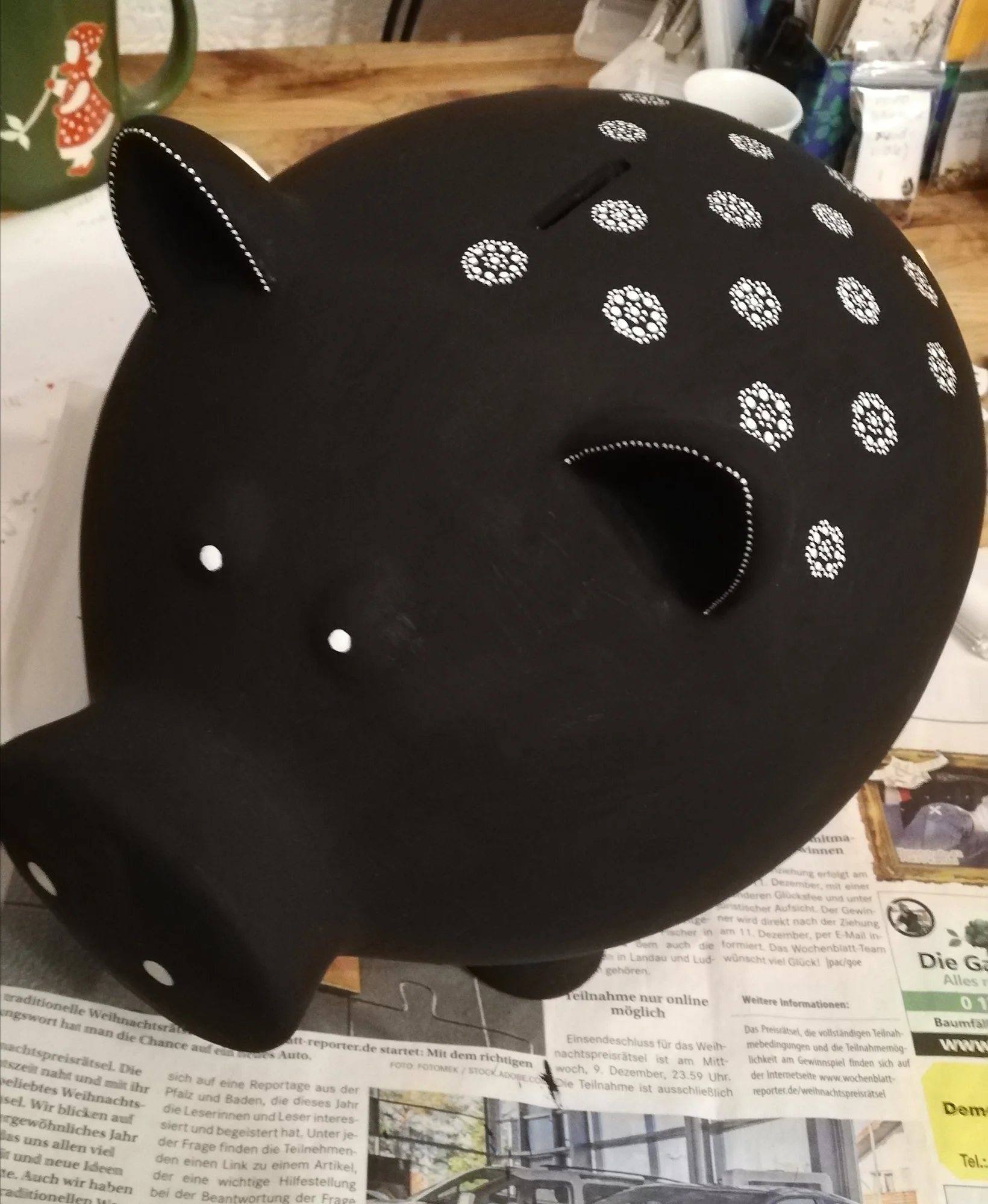 Ach, herrlich, Billa! :love: Das ist mal ne Uhr ... und die tüpfelgeblümte Sau erst - die hat doch hoffentlich ein Schloss unterm Bauch? Wär tragisch, wenn man die zerhämmern müsste, um an den Inhalt zu kommen! o_O
