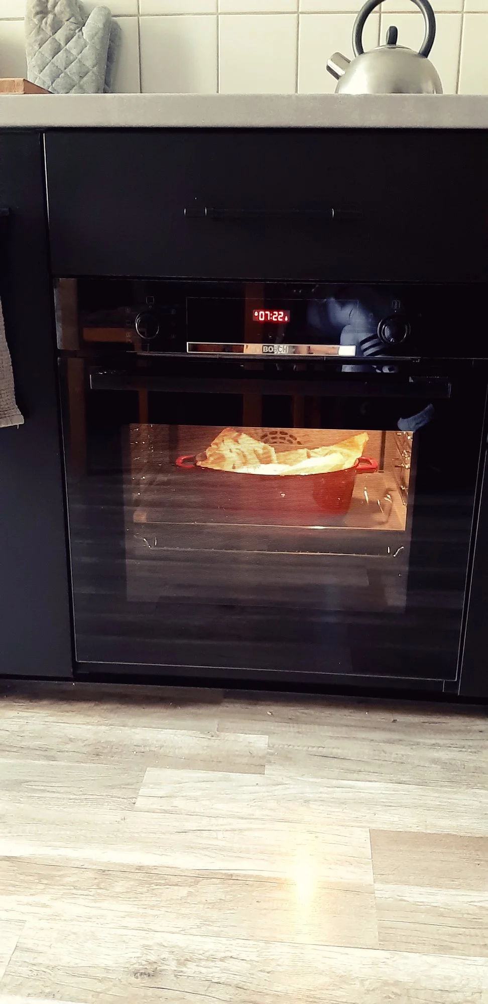 Aber zuerst zum Brot: Ja, wenn man mit Topf backt, werden die ersten 25 Minuten mit Deckel gebacken bei 250°. Dann kann man stufenweise mit der Temperatur runtergehen, zuerst auf 220°, dann 200. Manches Rezept geht sofort auf 200° runter, die Kruste bildet sich aber besser aus, wenn man stufenweise runterführt.
