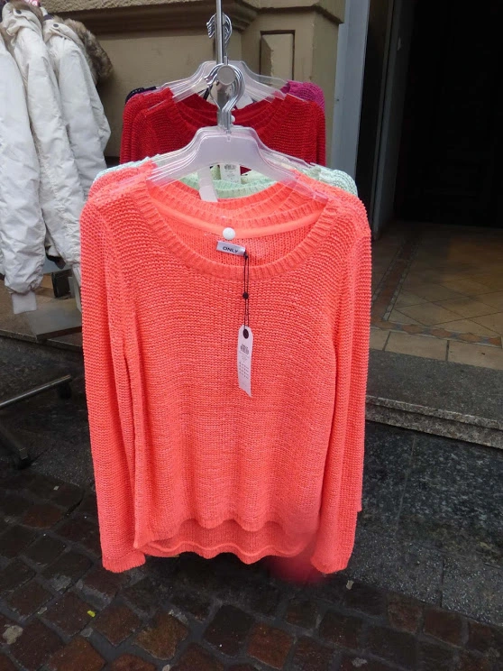 Geschieht dir recht. *lach* Und während du an der Kasse Schlange stehst, zieh ich dir schwupps diesen überaus hübschen Pullover über. Damit ich dich nimmer übersehe in deinem, äh, unauffälligen, kleinen Auto.