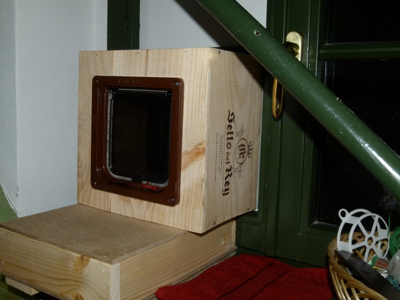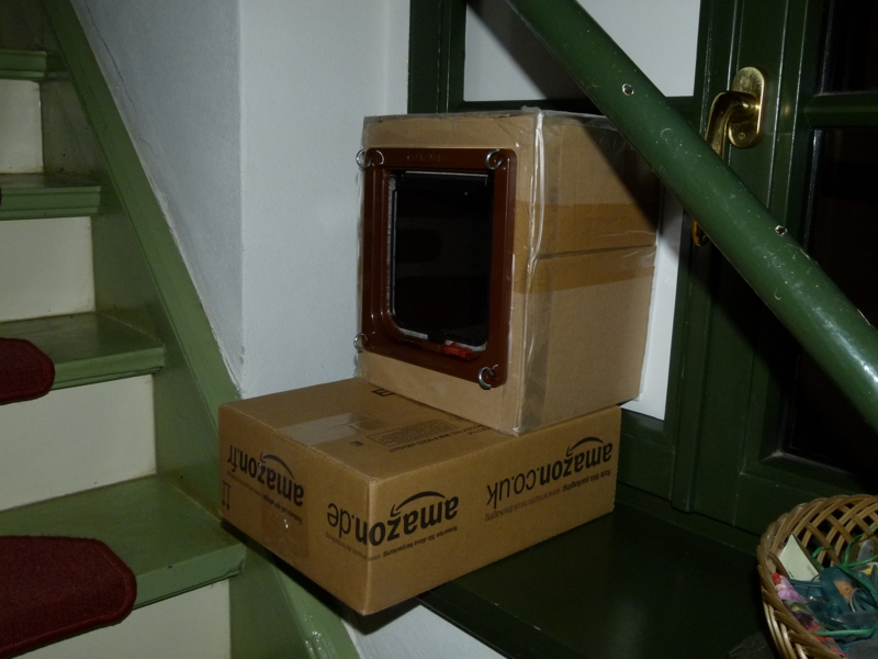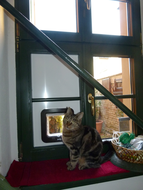 ich habe seit einigen tagen eine katzenklappe (so ein chipgestuertes ding wegen der vielen anderen katzen und marder und waschbären) im fenster oder besser, in so einer sandwichplatte, da ein einbau ins doppelgglas sehr sehr teuer gekommen wäre. der glasersatz ist so eine 3cm starke platte, innen styropur oder so ähnlich, außen eine schicht folierte plastik.