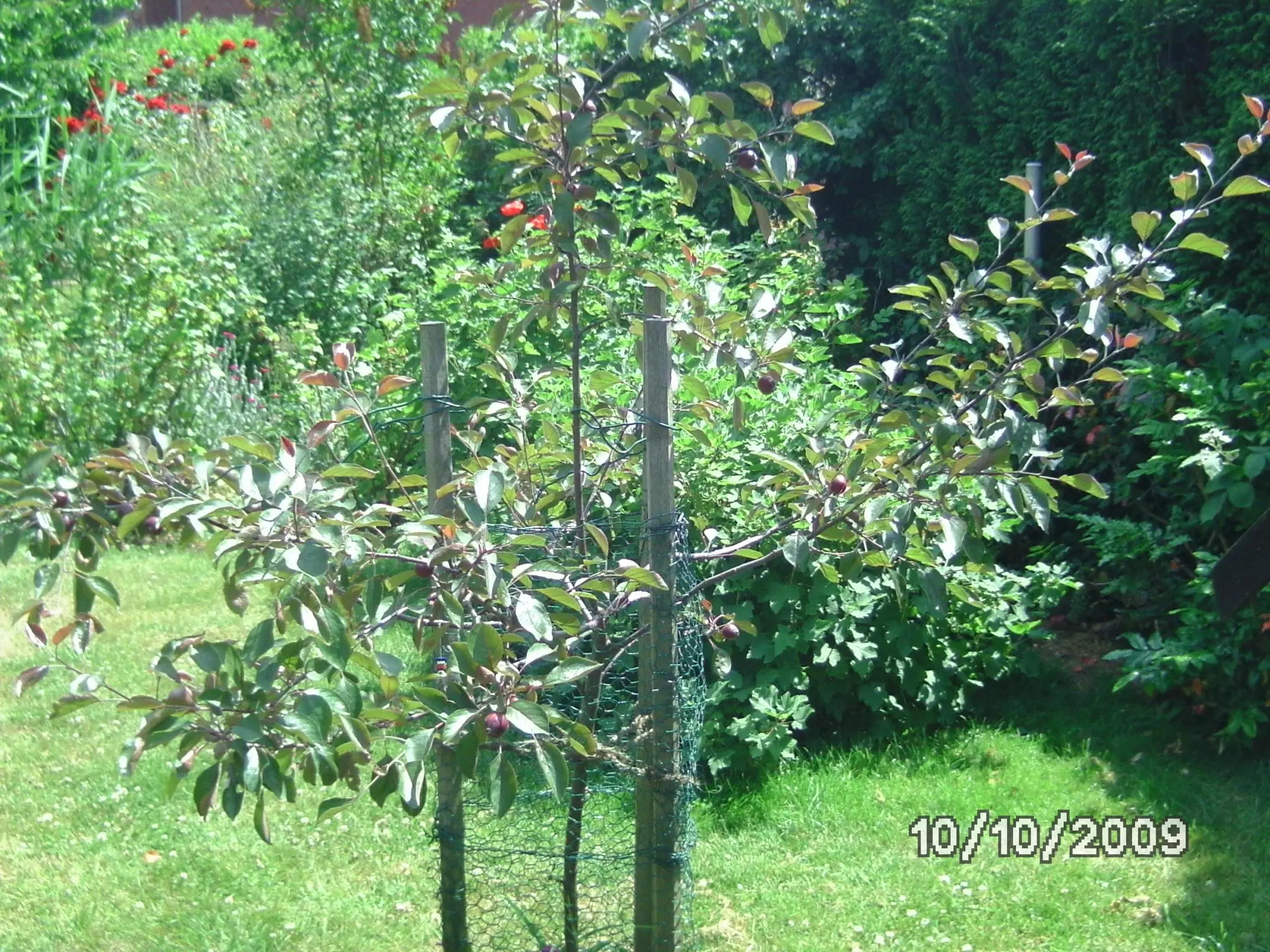 Der RedLove kriegt die ersten gelben Blätter. Ich habe eine Wühlmaus im Verdacht, die unten herumwurstelt. An die Wurzeln kann sie nicht, da ich den Ballen großzügig mit Drahtnetz gepflanzt habe, aber wenn sie dran vorbeigräbt, fließt das Wasser weg. Und von oben könnte sie auch rein. Zum Glück gieße ich die Neupflanzungen regelmäßig, und dabei prüfe ich auch die Baumscheibe auf Einfresslöcher. Werden umgehend zugestopft.
