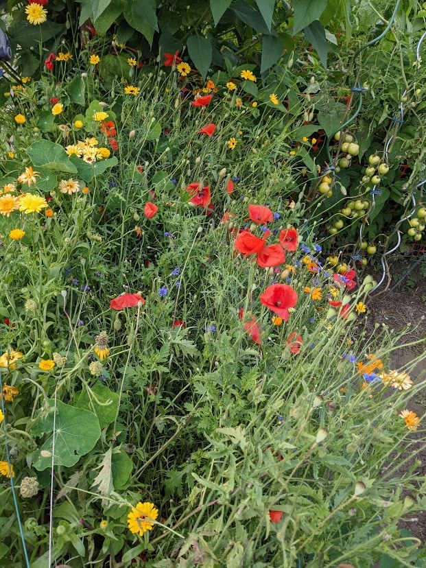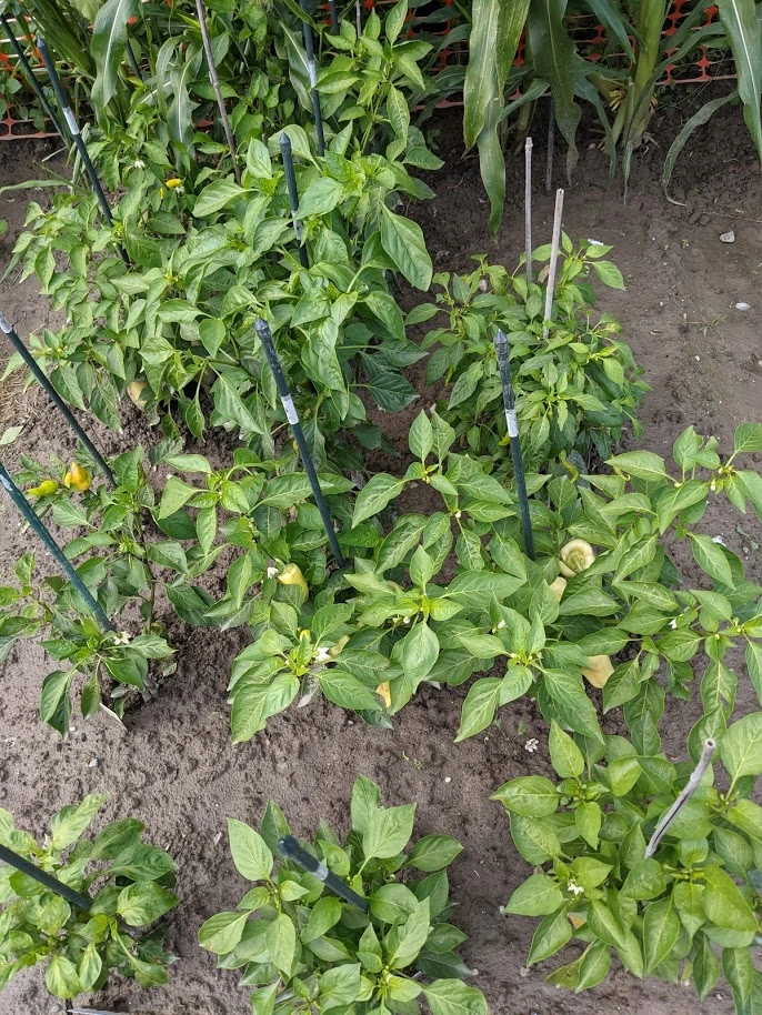 Da wieder Ordnung rein bringen wird wohl ein ziemlich umfangreiches Unterfangen - heute habe ich mal auf einer Hälfte den Boden gelockert + Unkraut gejätet, alle umgefallenen Pflanzen entfernt, die abgefaulte Zucchini entfernt, Erbsen entfernt und das Gerüst abgebaut, die frei werdenden Stäbe + Schnüre mal rund um den Mais/Sonnenblumen aufgebaut und diese etwas festgezurrt und dann noch die schadhaften Blätter/Früchte bei den Tomaten abgemacht. Mittlerweile fürchte ich, dass es auch keine so gute Idee war, die Tomaten mit Rasenschnitt zu mulchen - der ist nämlich auch komplett verfault.