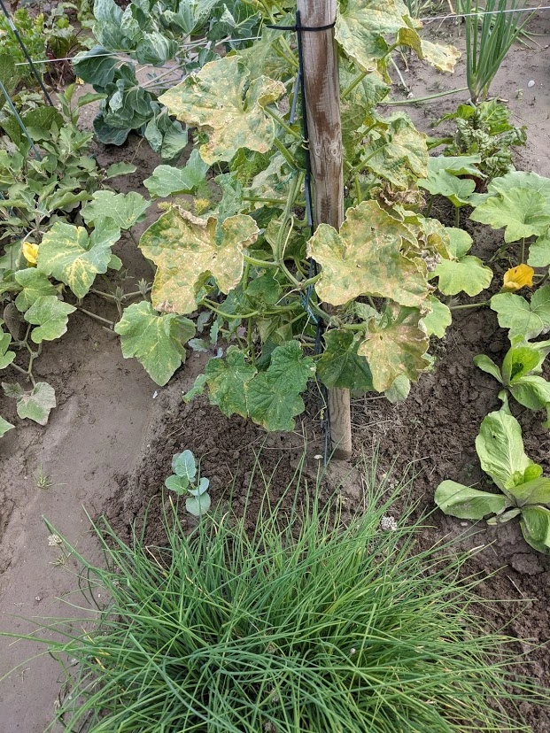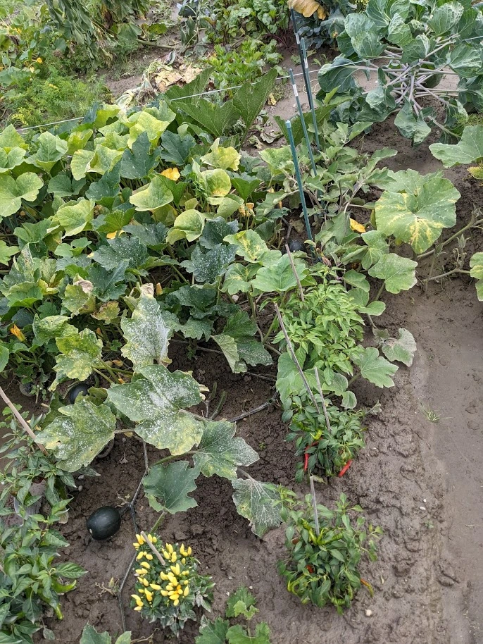 Das Bild im Anhang: Was ist das für eine schwarze Frucht? Auch ein Kürbis? Und die Mehltau-Blätter lässt du so dran?