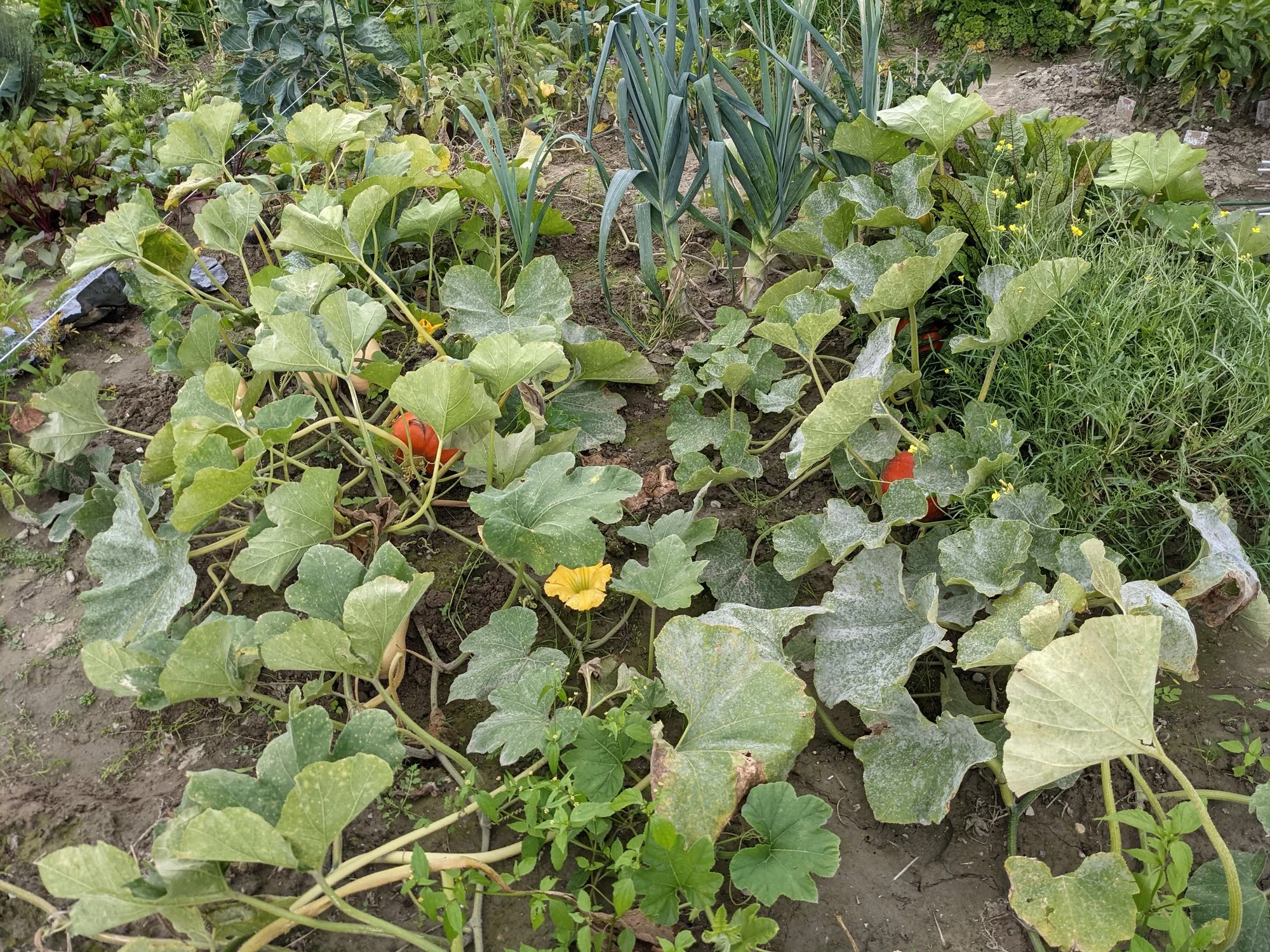 Das Bild im Anhang: Was ist das für eine schwarze Frucht? Auch ein Kürbis? Und die Mehltau-Blätter lässt du so dran?
