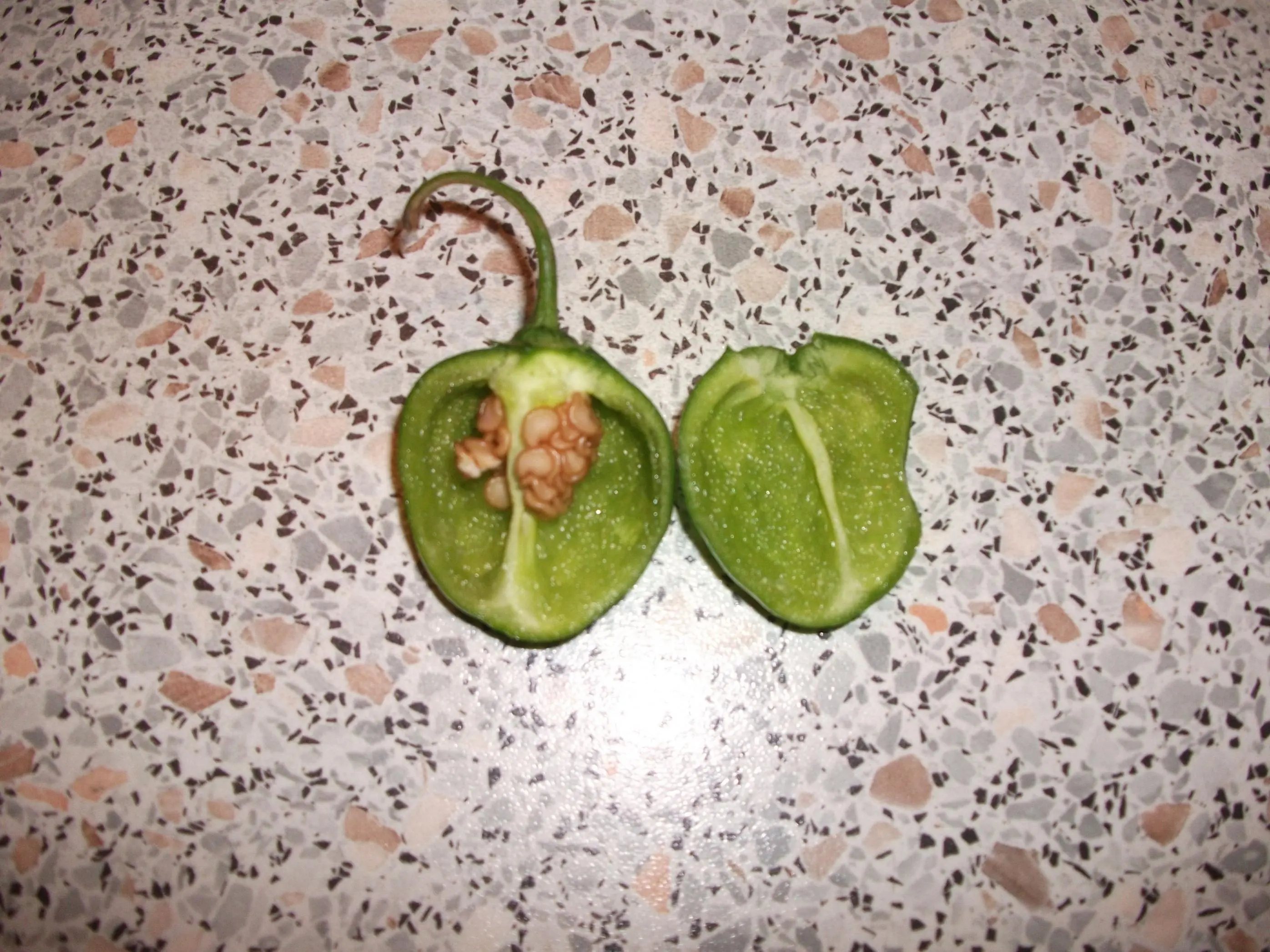 Davon habe ich dann einige eingesammelt und die größte Frucht vom Baumchili (ca.14 gr. schwer) aufgeschnitten und probiert.
