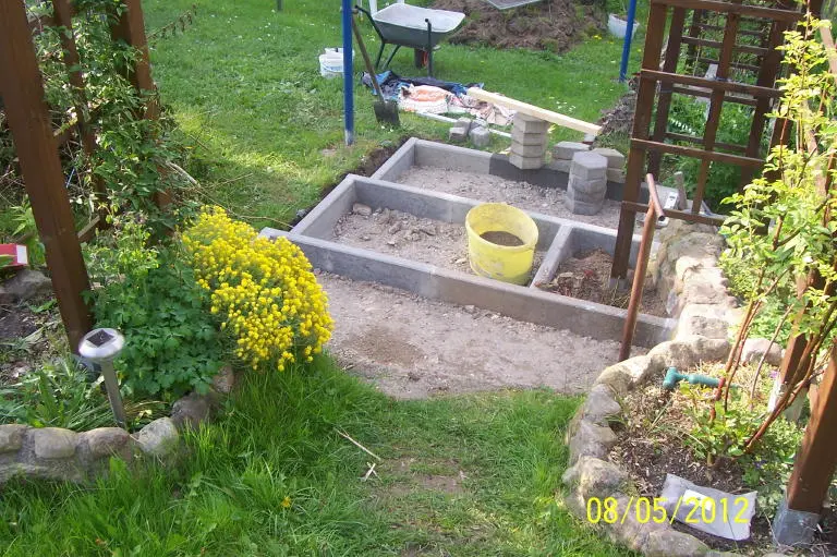 Hier baut mein GG mir derzeit eine Treppe zum Wäscheplatz, da ich hier aufgrund der Hanglage unseres Grundstückes auf feuchtem Gras schon ganz schön ins Schlittern gekommen bin. Und wenn Ihr genau schaut, auch hier wird eine kleine Pflanzfläche integriert und die Rose sitzt schon :grins: