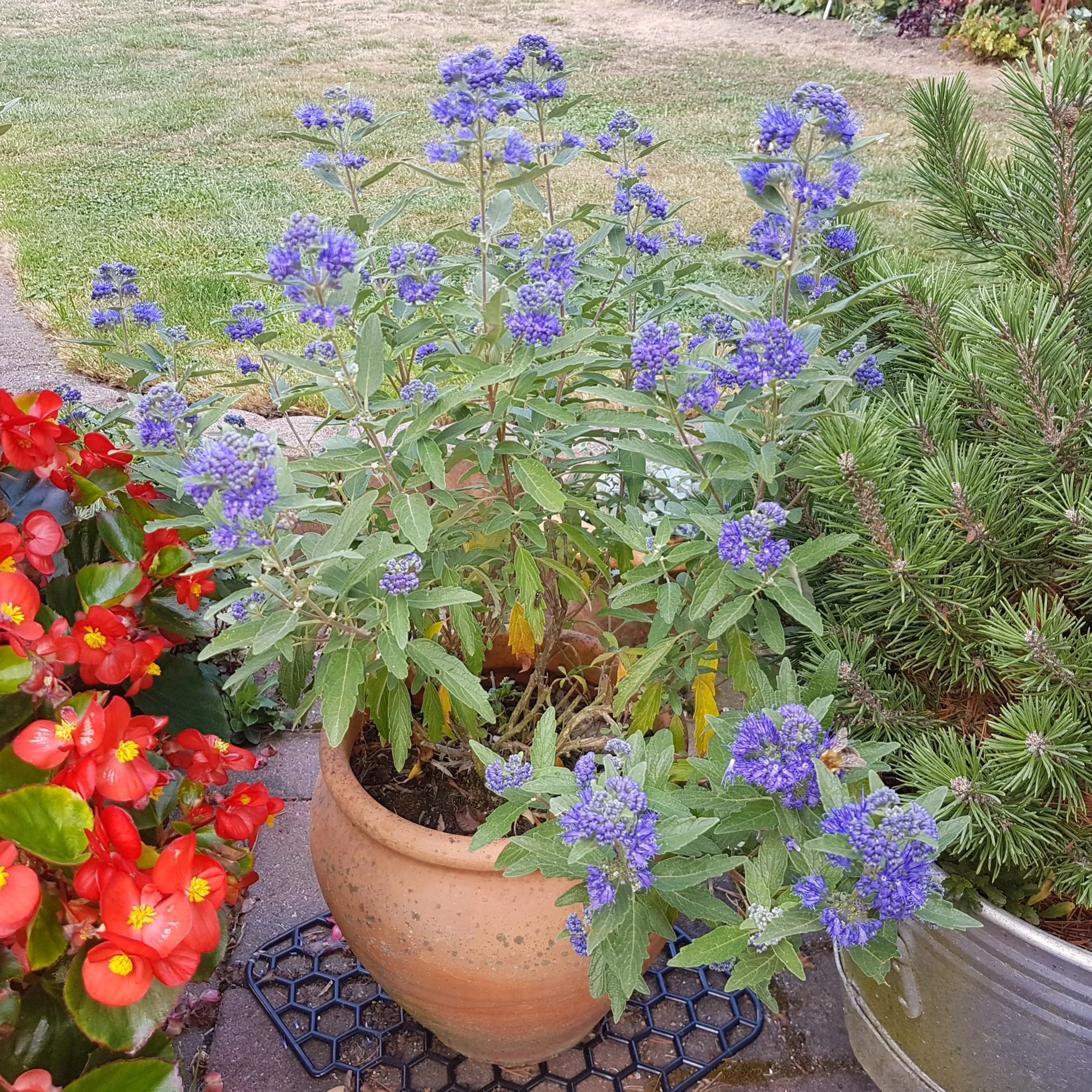 Ich hab im Zusammenhang mit Bartblume das Wort "Halbstrauch" im Hinterkopf, ohne genau zu wissen, was eigentlich ein Halbstrauch ist. Vom Aussehen her passt deine Beschreibung "klitzekleiner Strauch".