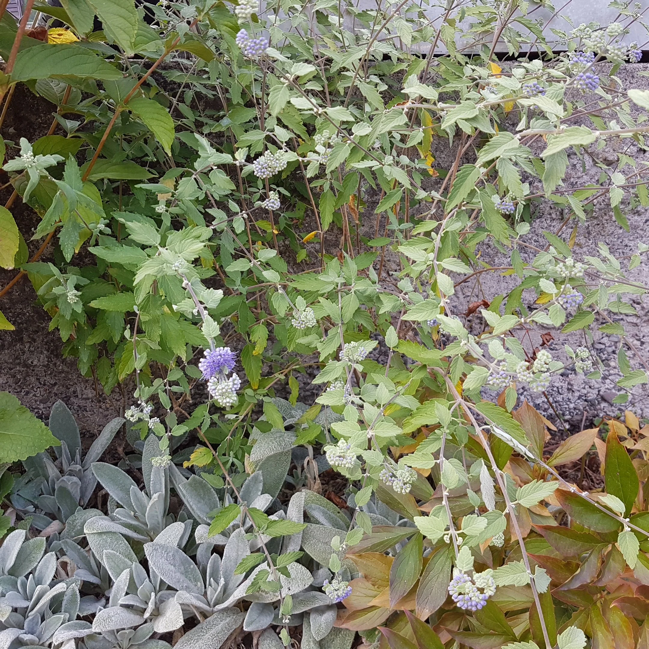 Ich hab im Zusammenhang mit Bartblume das Wort "Halbstrauch" im Hinterkopf, ohne genau zu wissen, was eigentlich ein Halbstrauch ist. Vom Aussehen her passt deine Beschreibung "klitzekleiner Strauch". :D