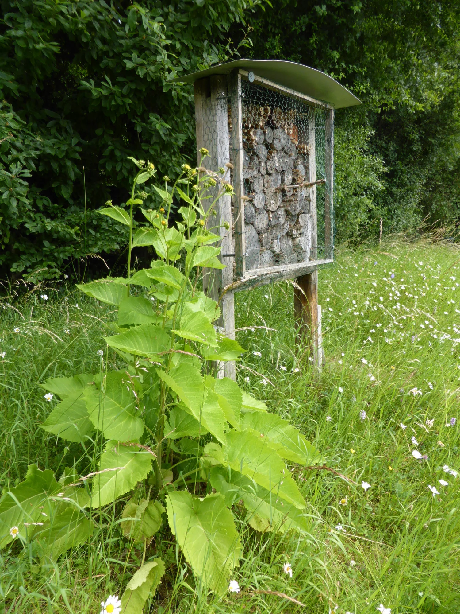 • Pyro, die im Frühjahr geteilte Telekie blüht in allen 3 Teilpflanzen. Sie sind jetzt 80 bis 100 cm hoch, zur Freude auch der Gäste im benachbarten Insektenhotel.