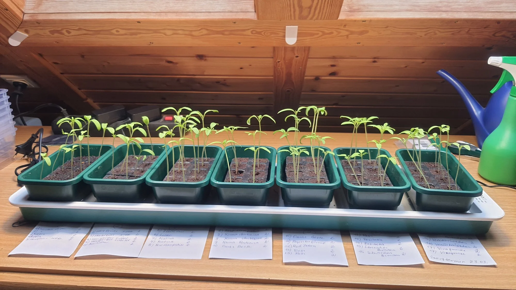 Nächste Woche kommen die ersten Pflänzchen in 200-ml- Trinkbecher als erste Anzuchtstation.