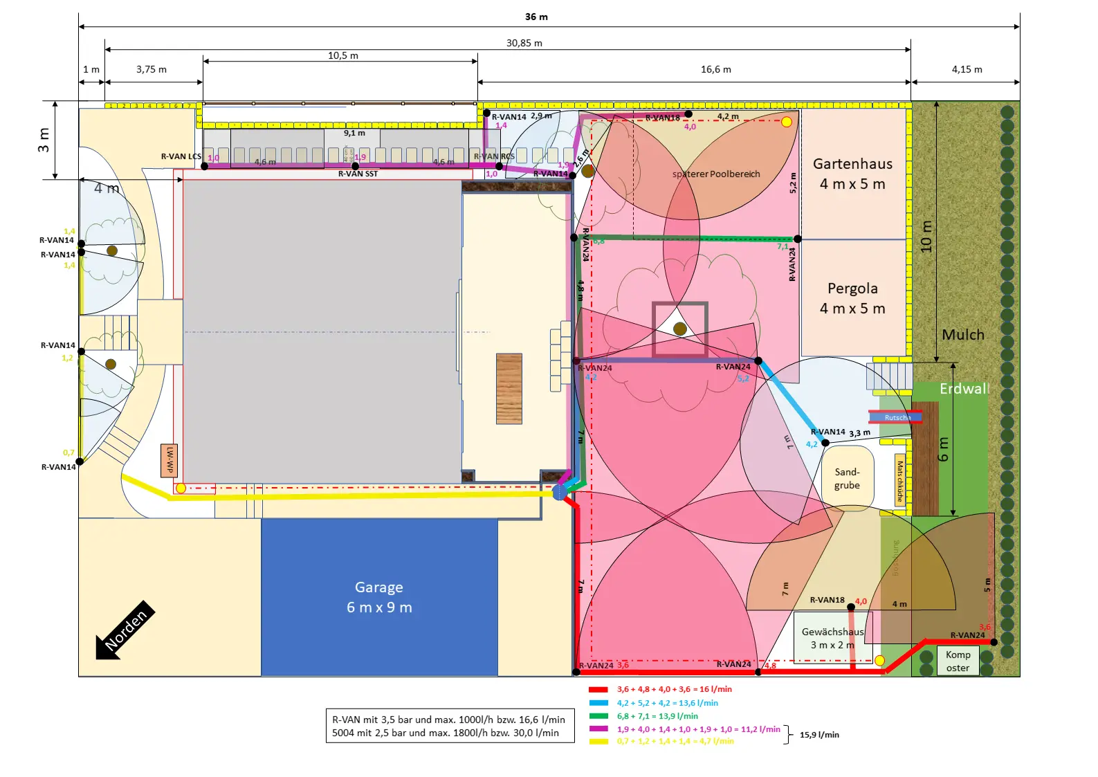 EDIT: Ich habe jetzt auch noch Regner 14 ergänzt und versucht Kreise (A - F) zu bilden mit max. 16,6 l/min (ich hoffe, ich habe den Verbrauch richtig eingeschätzt)