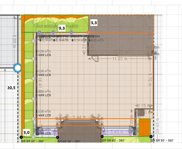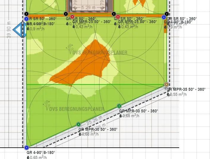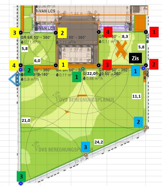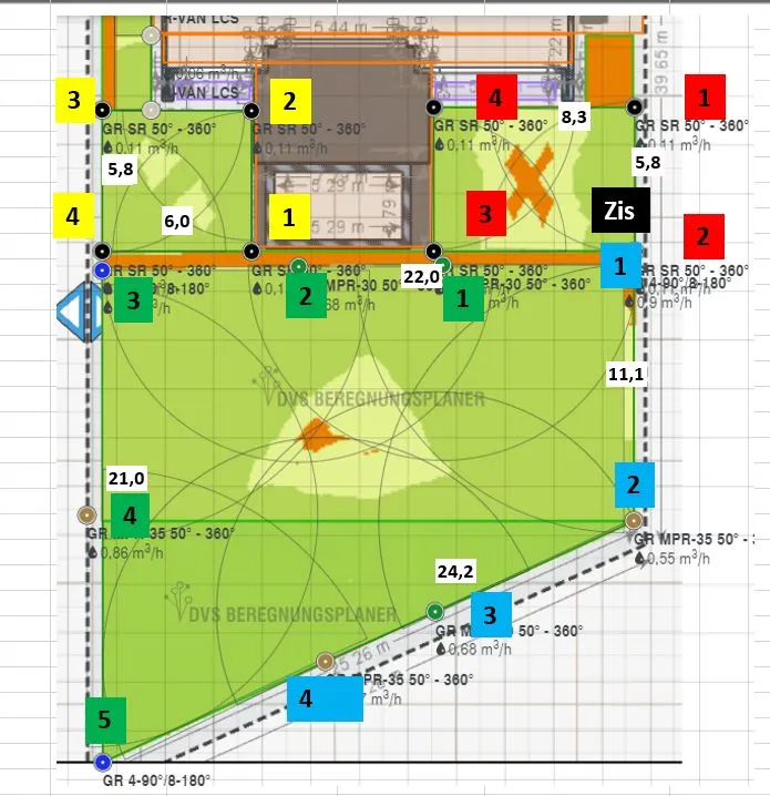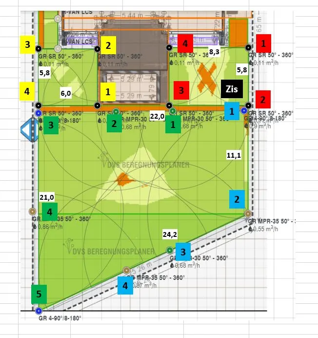 3. ich habe ums Haus herum (2. Bild ohne Sprengernummerierung) eine 3m breite Gasse. Abzgl. Traukante und Hecke reduziert sich die Rasenfläche auf 2m Breite. Via DVS habe ich dort Streifenregner eingesetzt, die auf der Hausseite sitzen und vom Haus wegsprühen, da ich es umgekehrt nicht möchte, habe ich Probleme mit der "Zick-Zack" Ausführung der Sprenger. Würde das so funktionieren? Andere Ideen?