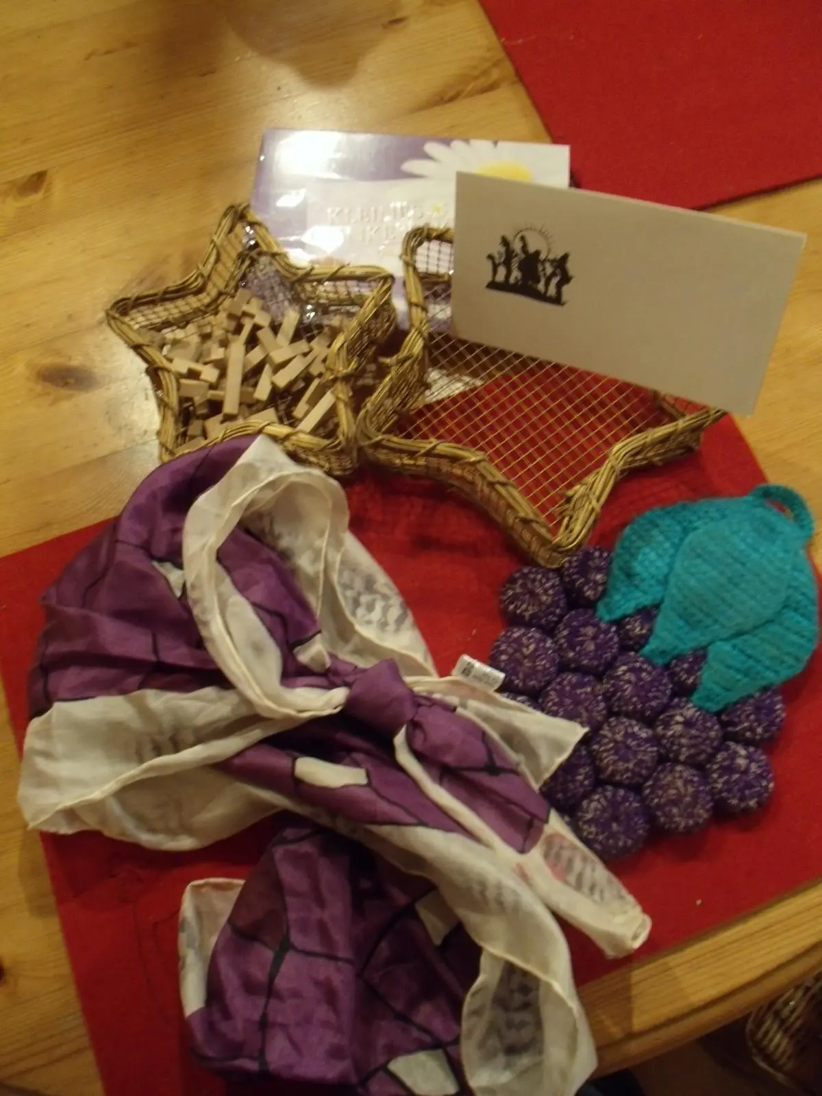 und darin ein Steckspiel - das werde ich wohl bis zur Rente nicht gelöst haben:d - ein wunderschöner handgemalter Seidenschal und ein selbst gehäkelter Untersetzer machen mir auch viel Freude:D