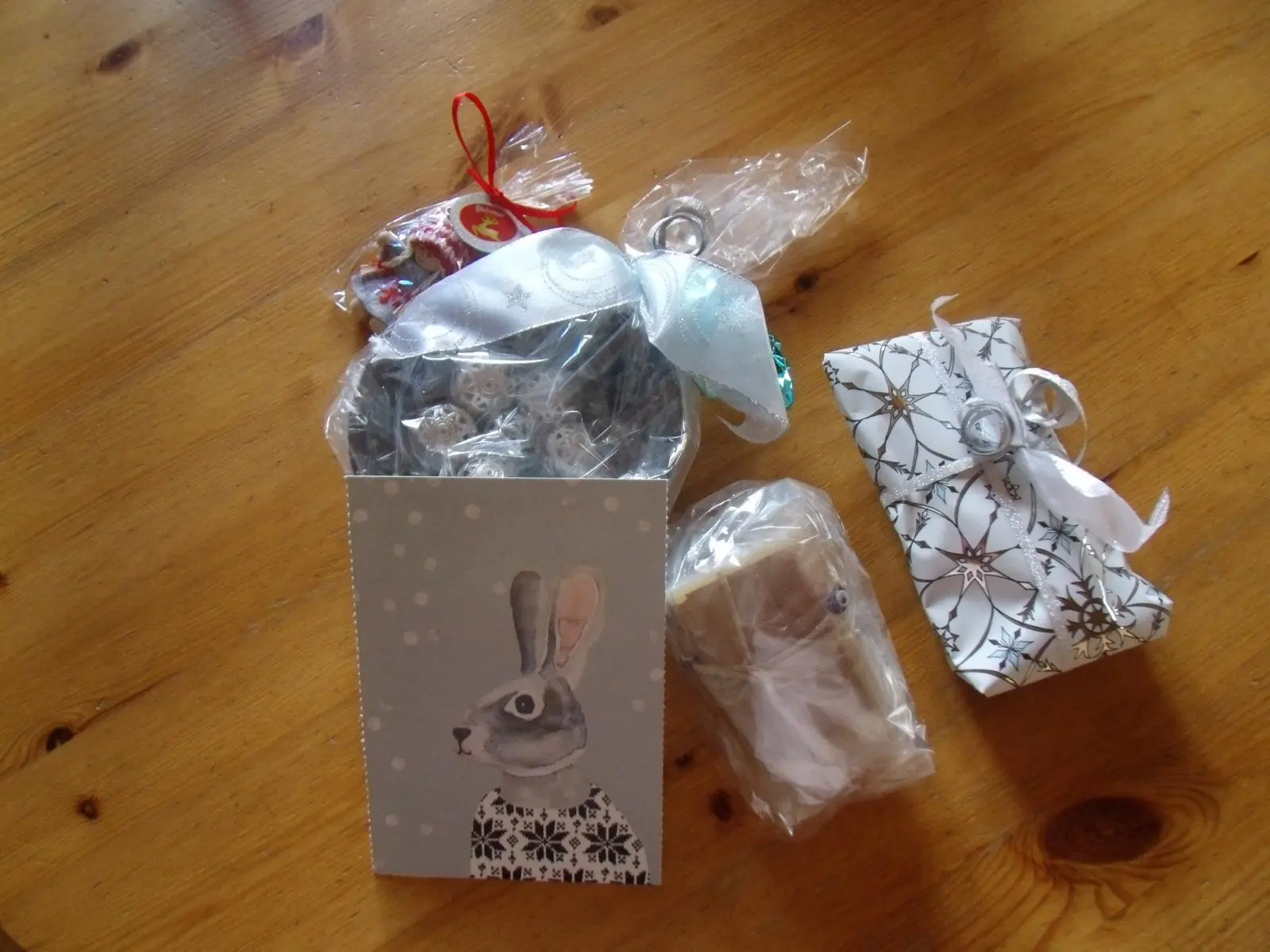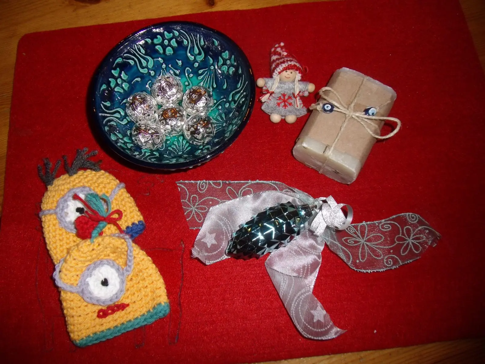 Eine Hasi-Karte, eine kleine Schale in türkis-blau gefüllt mit grazilen, silbernen Kugeln, eine handgemachte Seife mit sehr angenehmem Duft, 2 handgehäkelten Minions-Eierwärmern für die Kurze und einem Weihnachtsanhänger, den die Kurze auch gleich "einkassiert" hat:rolleyes: