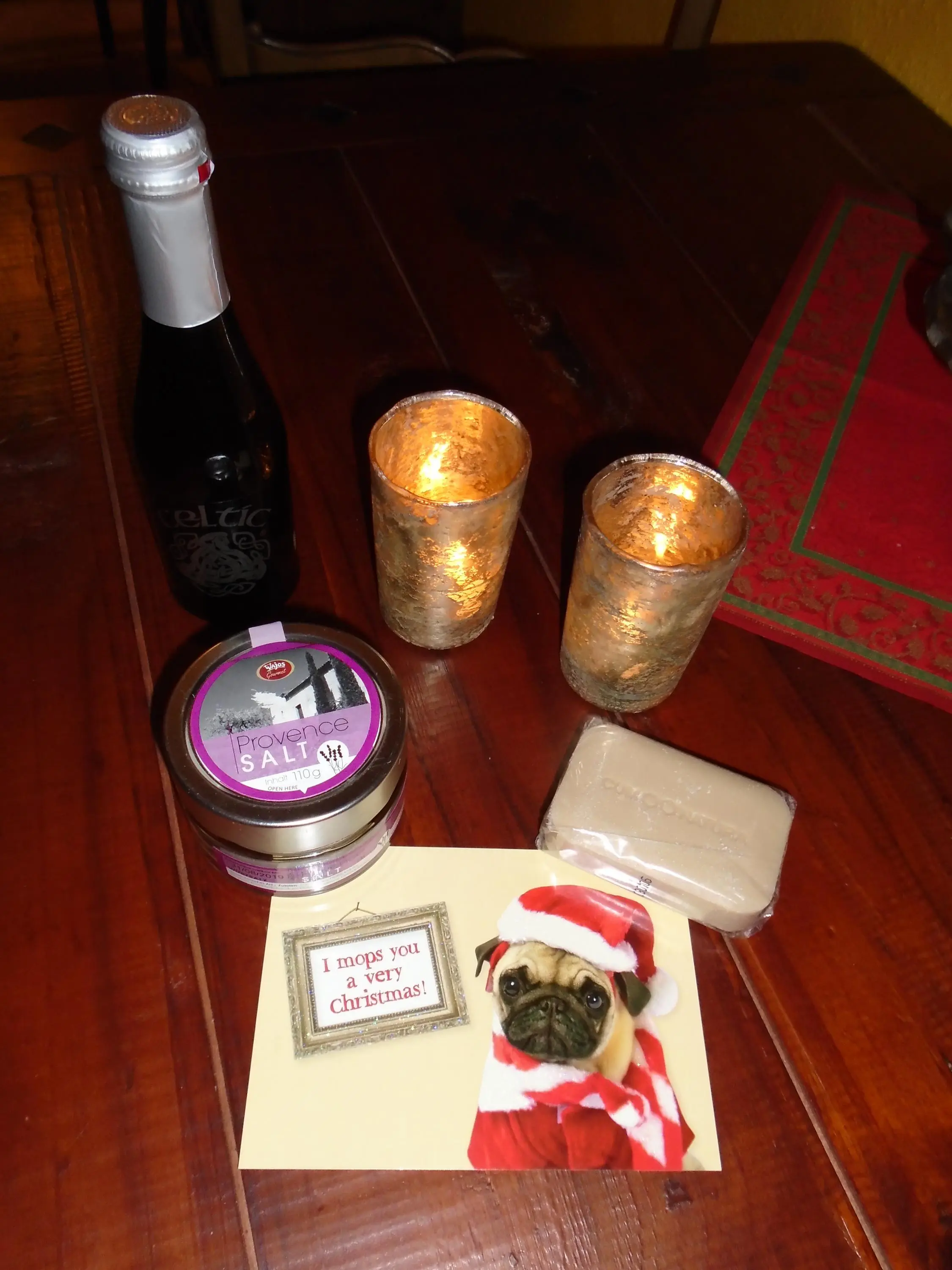Zwei wunderschöne Windlichter mit duftenden Teelichtern,ein Fläschchen Honigperlwein,Gewürzsalz aus der Provence,eine tolle,nach Honig duftende Seife und eine lustige Karte.
