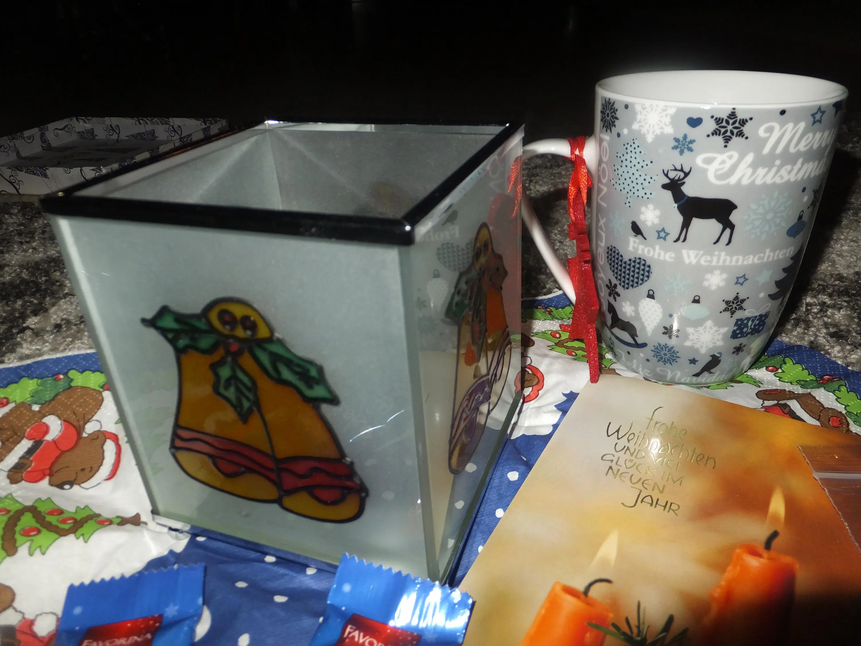 Das Elch-Teelicht steht schon auf meinem Schreibtisch und beleuchtet die tolle Weihnachtskarte von dir.