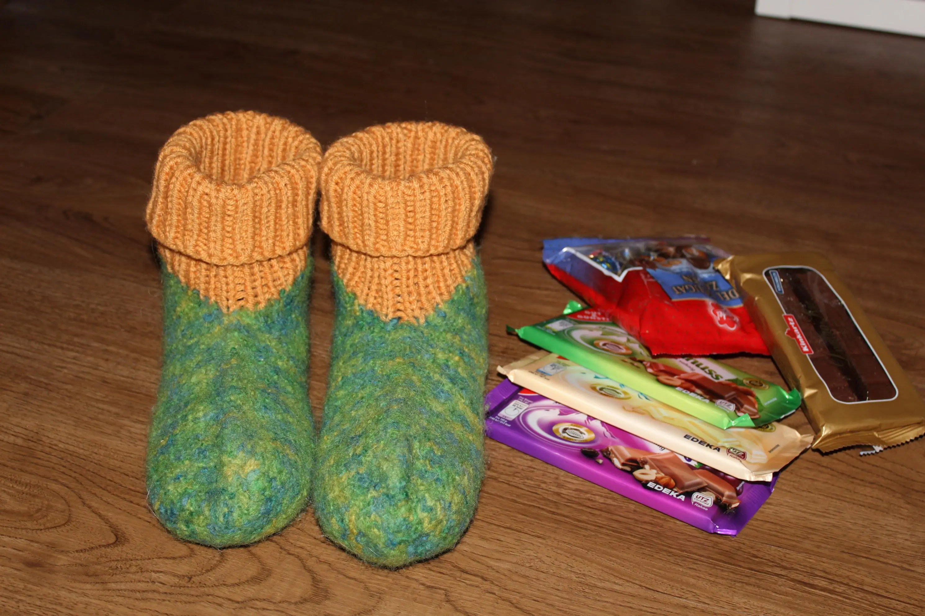 Die selbstgemachten Stulpen sind leider nicht auf dem Bild. Die liegen im Gästezimmer. Dort schläft sich mein Schwager gerade den Rausch vom Mittagsgelage aus.