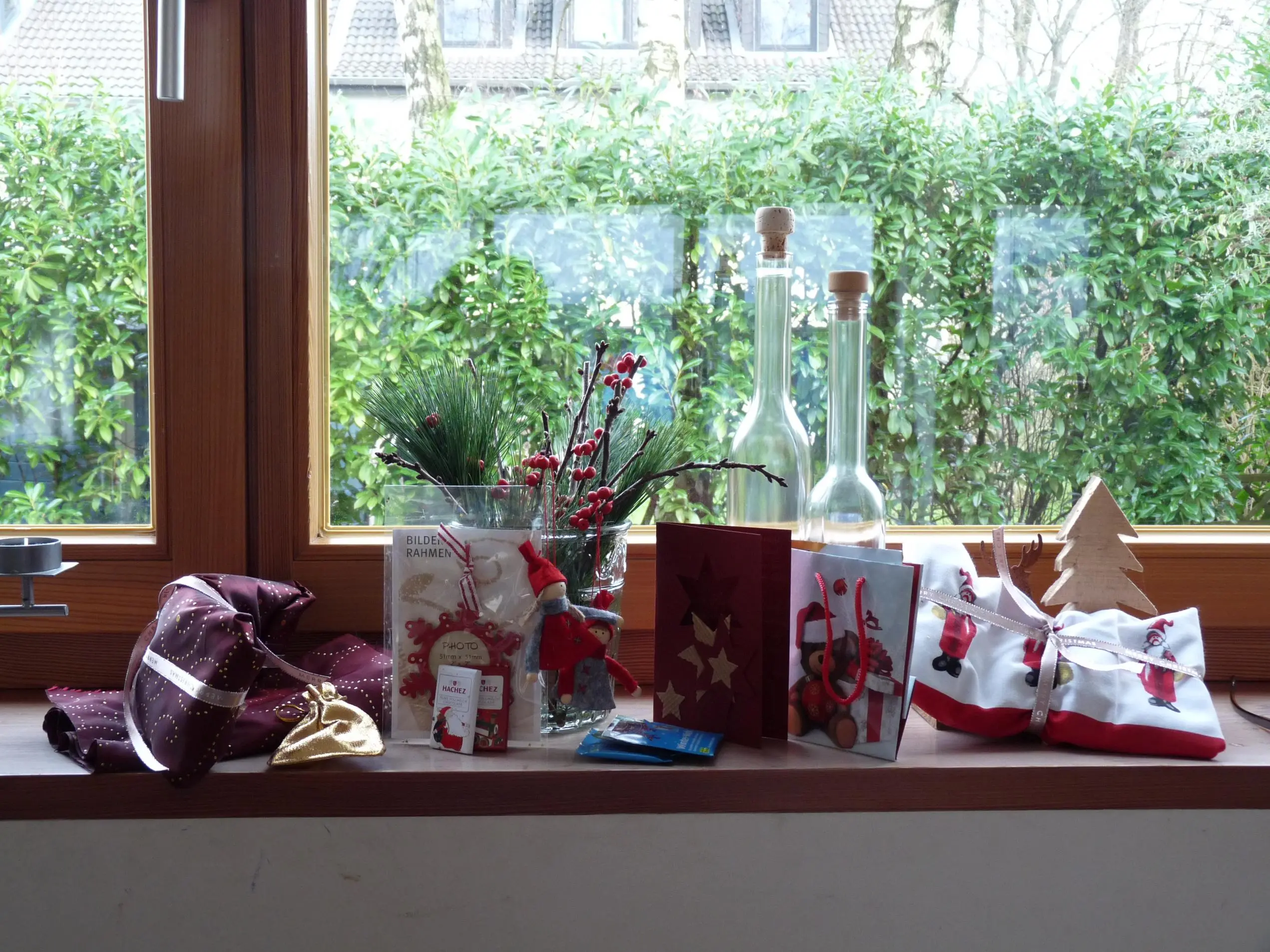 Als ich das Paket öffnete sah ich einen Umschlag mit einer Wichtelkarte sowie einige Nadelzweige mit Dekosternen. Darunter lagen ein Nikolaussack mit 1 Glas Harissa (ich liebe Harissa!!!) sowie 1Glas Quitten-Apfel Gelee mit Zitrone als Inhalt, 1 Spirituosen-Flachmann mit Wattenläufer, 1 Chili-Schokolade von Lindt, 1 Packung Tee sowie ein Keramikvögelchen mit Nikolausmütze.