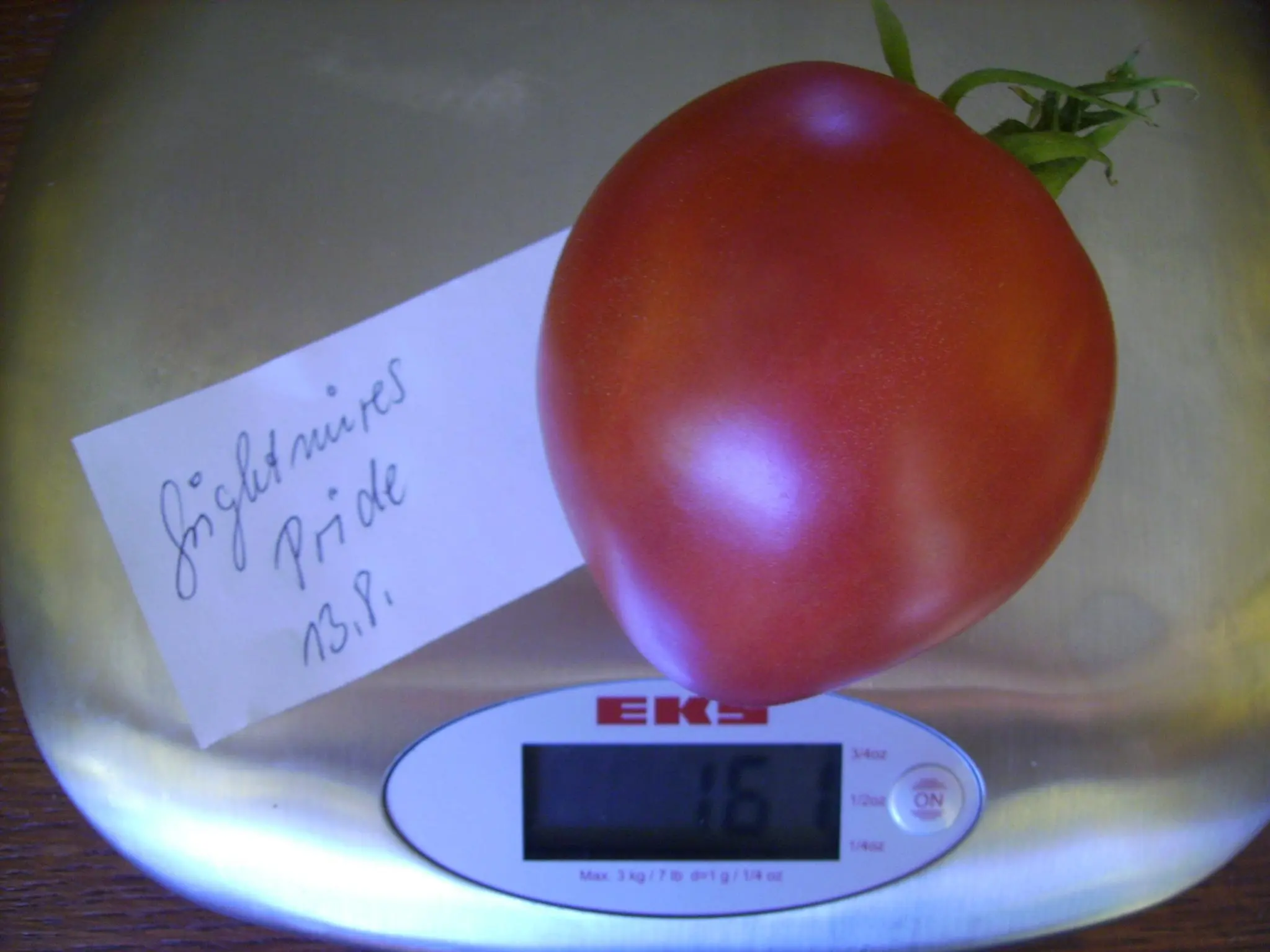 Auch diese Tomate wurde in meiner Abwesenheit geerntet und ich muß mich auf das Urteil meiner Kinder verlassen. Es hat ewig gedauert, bis sie ausgereift war.