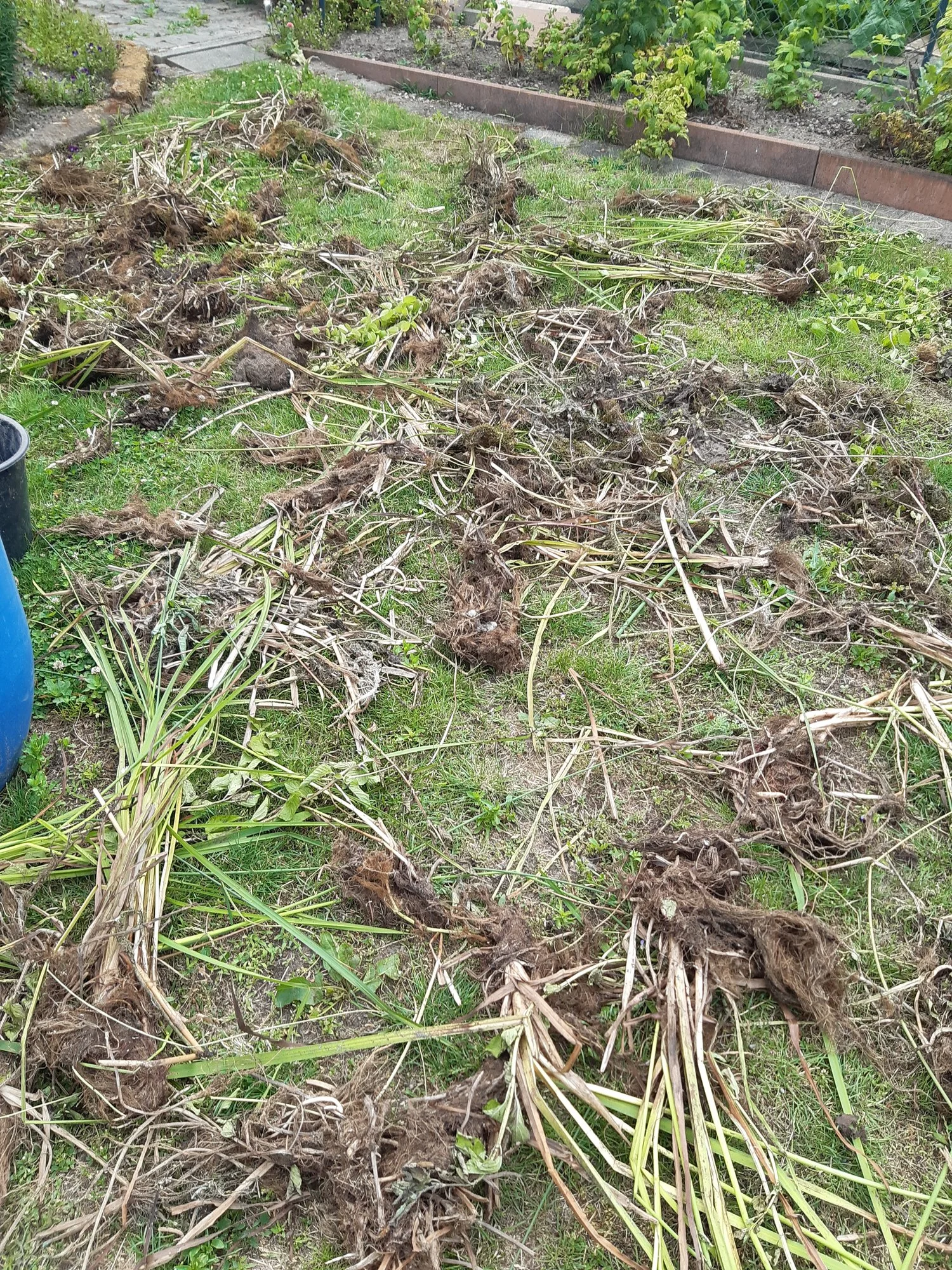 Jetzt sind kleine Teile Pflanzen wieder eingesetzt und der Teich auch wieder aufgefüllt. Die restliche Biomasse liegt auf dem Rasen und soll später auf den Kompost im oberen Garten. Wenn noch Teichbewohner drin sitzen, haben die jetzt die Gelegenheit, zurüchzukrabbeln. Gefunden haben wir nur ein paar Libellenlarven, die natürlich wieder eingesetzt wurden.
