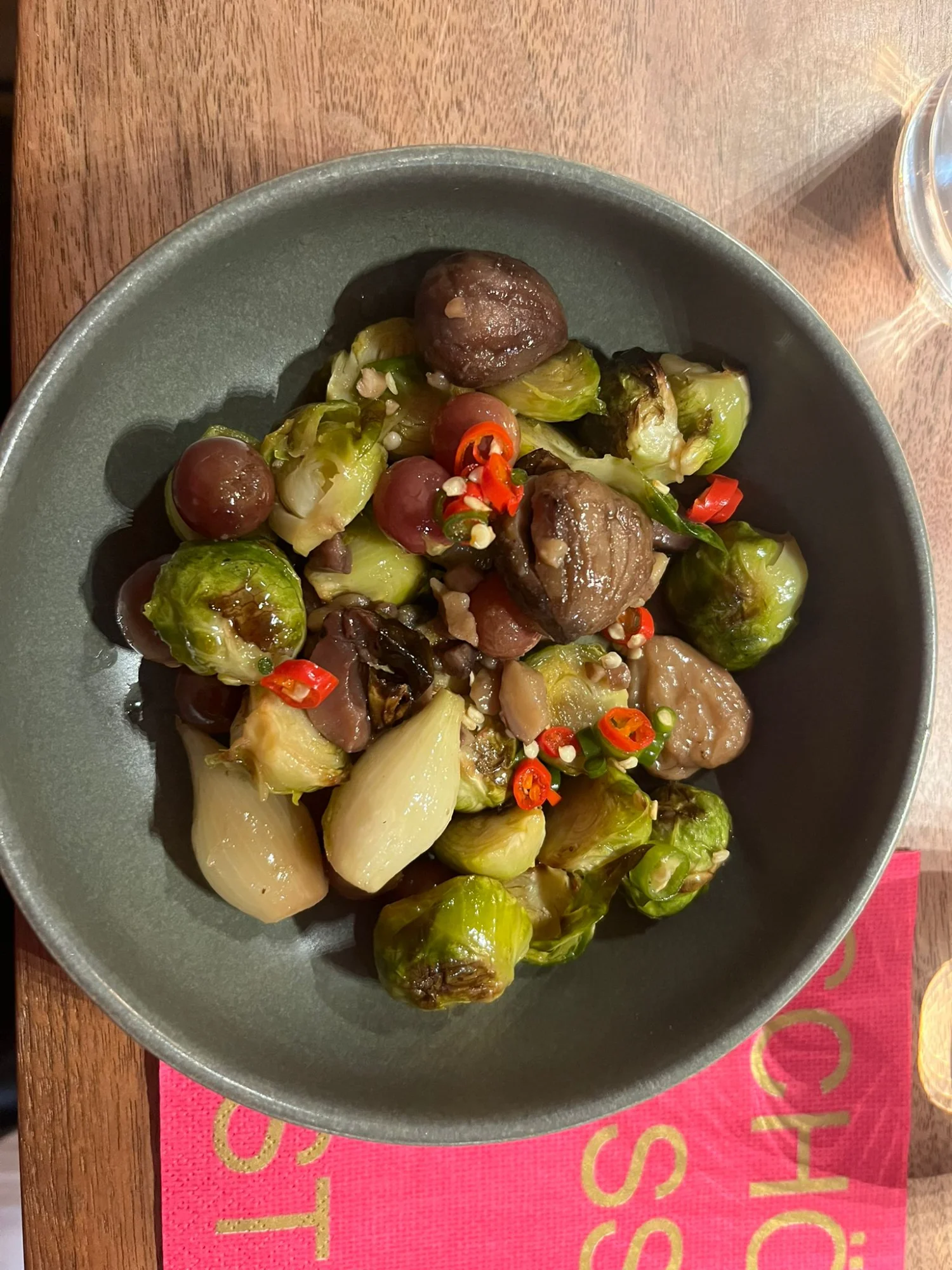 Maronen Rosenkohl süß-sauer mit Weintrauben und Chili Reisessig Sauce