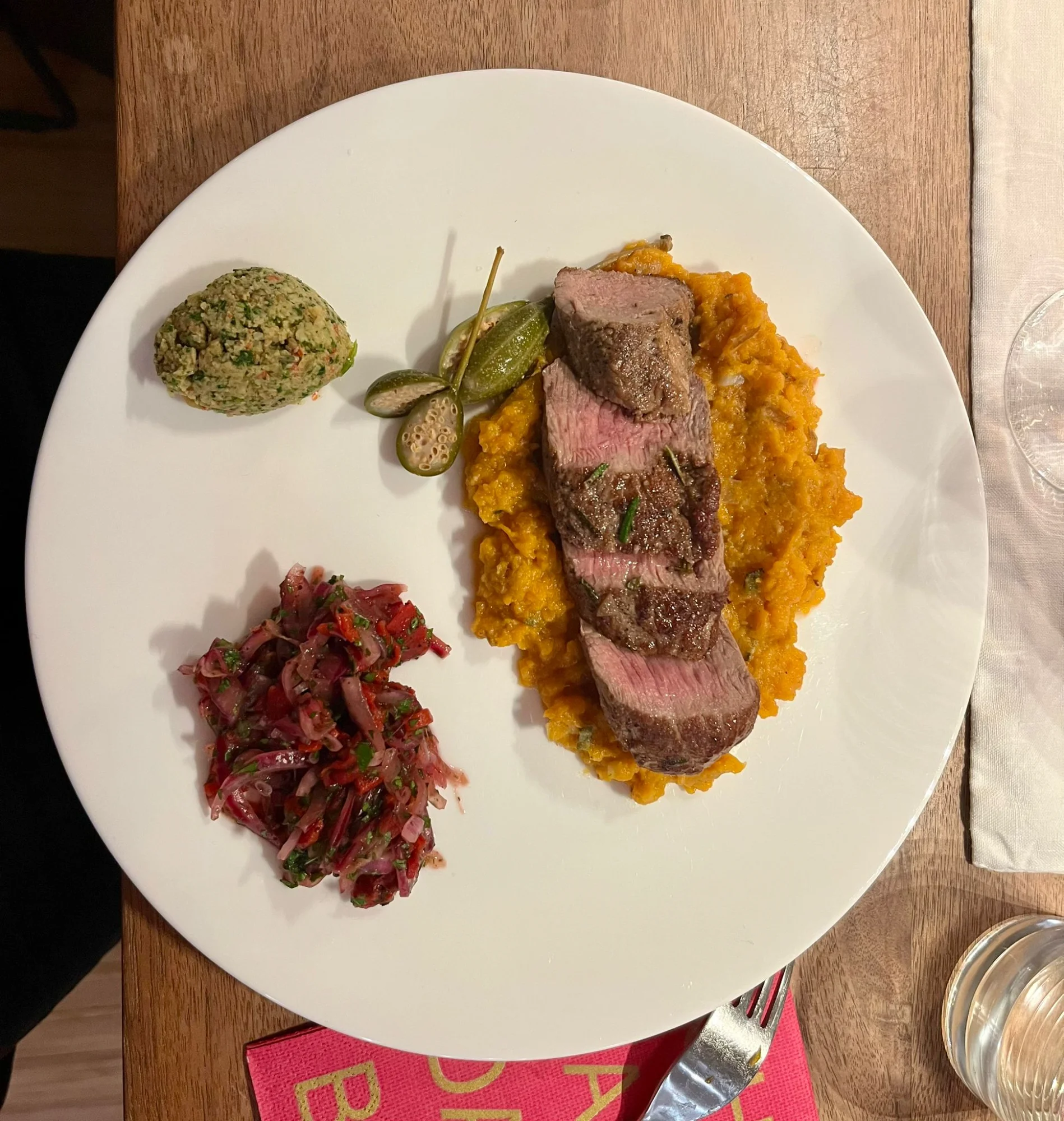 Lammfilet auf Süsskartoffelpürre mit Erdnuss-Sauce, Kapern und rotem Zwiebel-paprika Relish