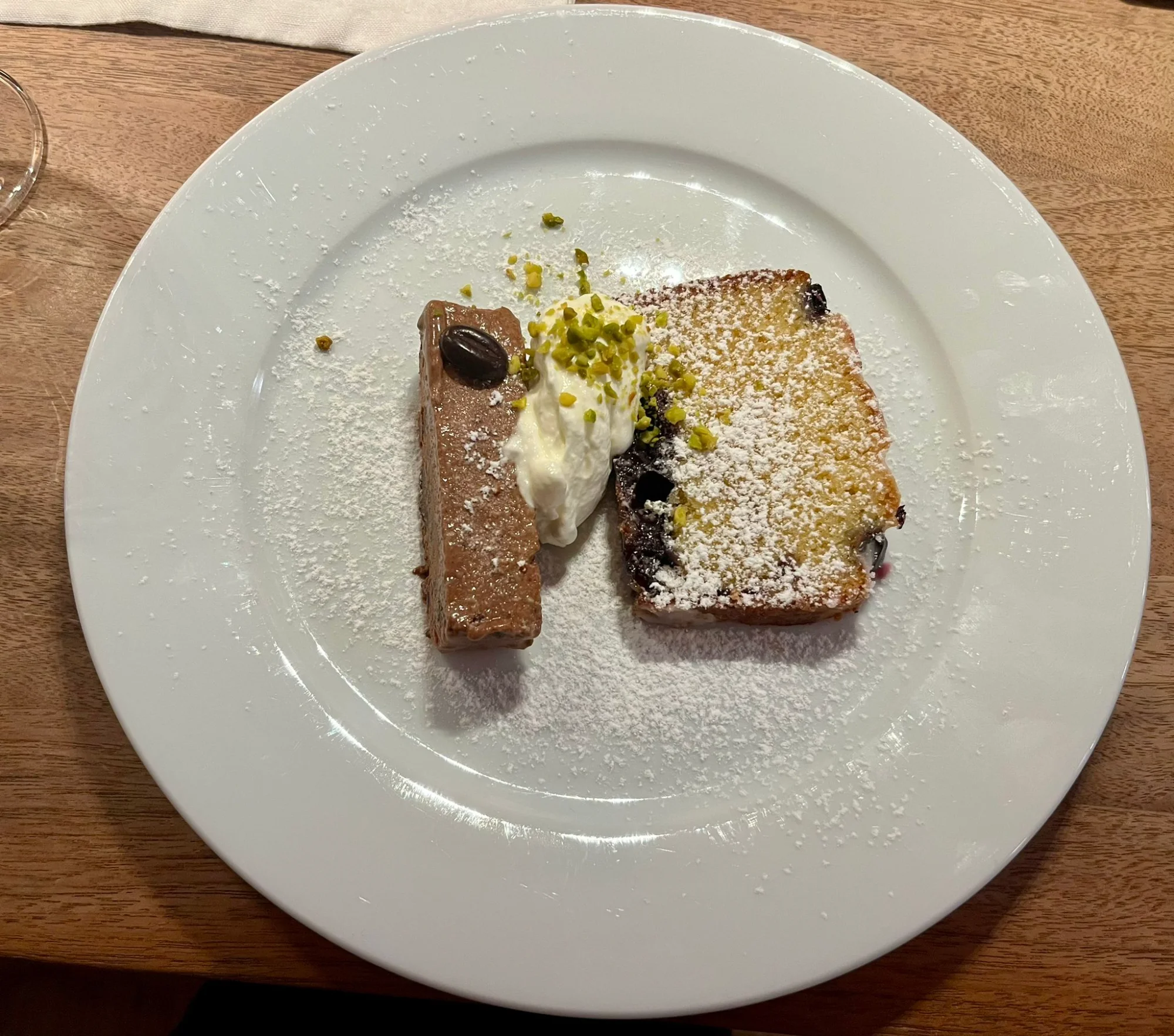 Waldbeer- Zitronenkuchen mit Moccaparfait und Pistaziensahne