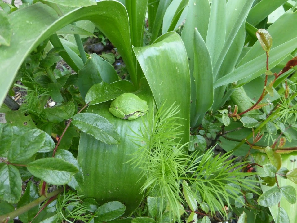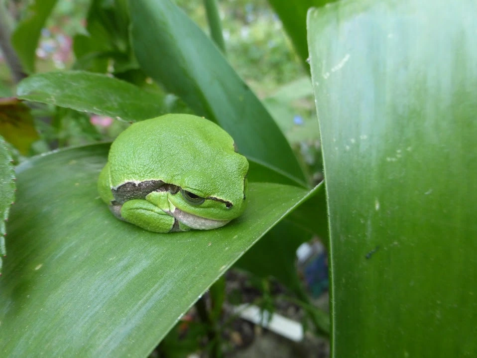 Mein Dickerchen von Laubfrosch pennt auf demselben Blatt wie gestern, und mein Agapanthus-Topf quakt wieder - ich habe schon den kleineren Laubfrosch drin begrüßt. Er dreht sich schon automatisch von der bösen schwarzen Kameralinse weg. Lernfähig, das Tier. Schlääächt für mich.