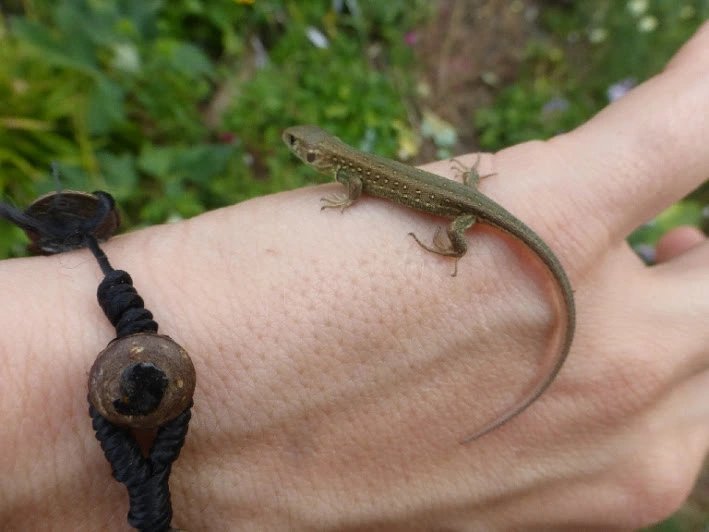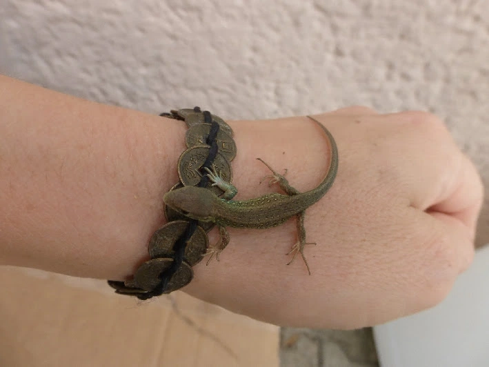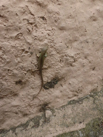 Ich habe schon mehrmals winzige Eidechsenbabys durch meinen Garten huschen sehen. Leider habe ich bisher keins aufs Foto gekriegt. Heute nun doch: Eins lief nahe der Haustür hinter einer Kiste die Wand hoch.