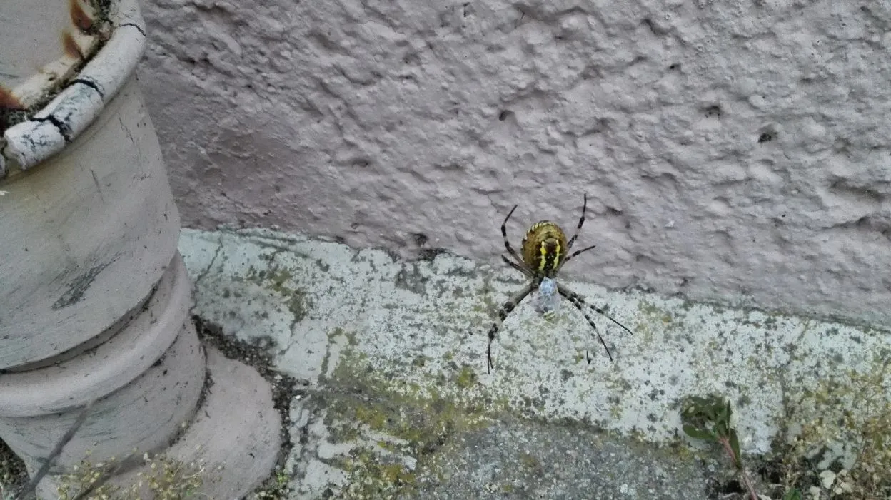 Extradickes Exemplar einer Wespenspinne mit verspeister Wespe.