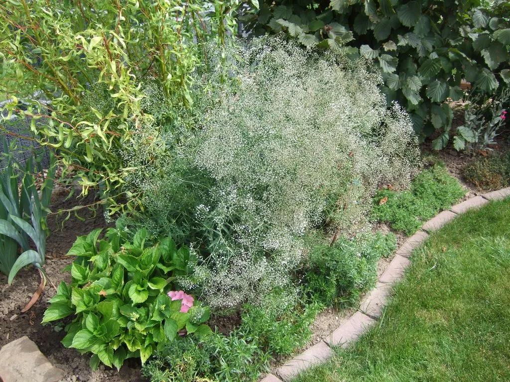 Die erste Hortensienblüte zeigt sich, versteckt unterm Schleierkraut: