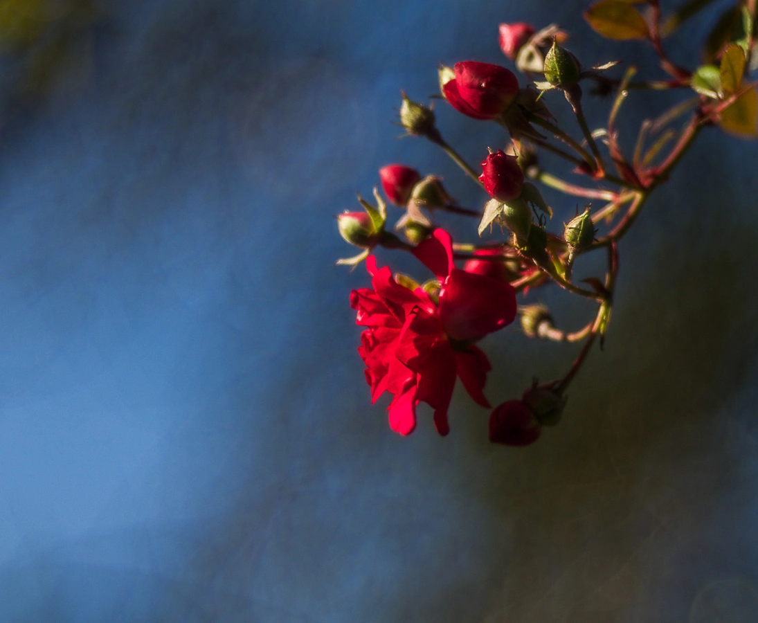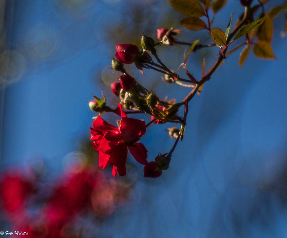 Wie hast du denn ein Blatt beim Fallen erwischen können, Melitta?! Und wieso hat das Rosenbild einen so herrlichen blauen Hintergrund??