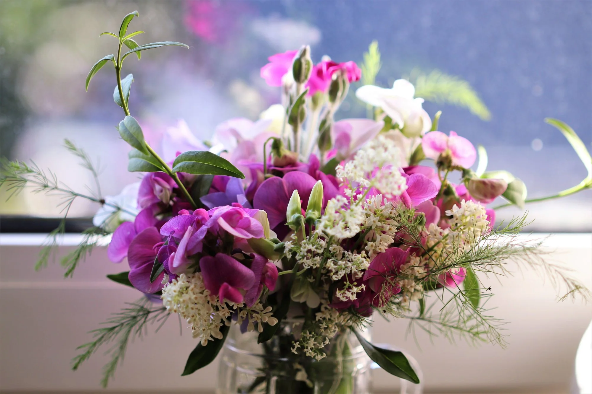 Spornblumen hab ich gar nicht im Garten. Im Sträußchen stecken fast nur rosa und weiße Wicken, dazwischen paar Ligusterblüten und irgendwas ganz Filigranes, Namenloses aus der Wildblumenwiese.
