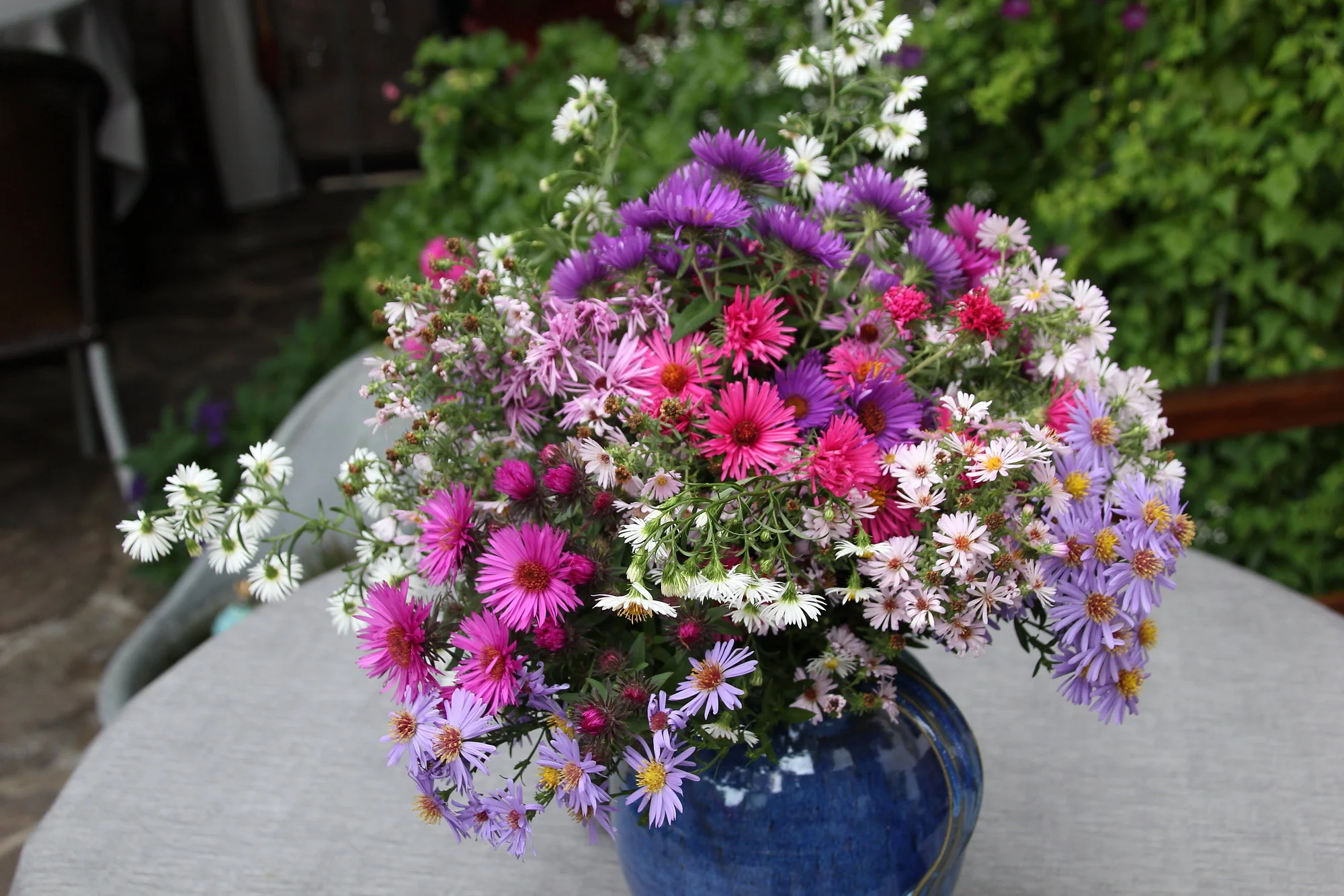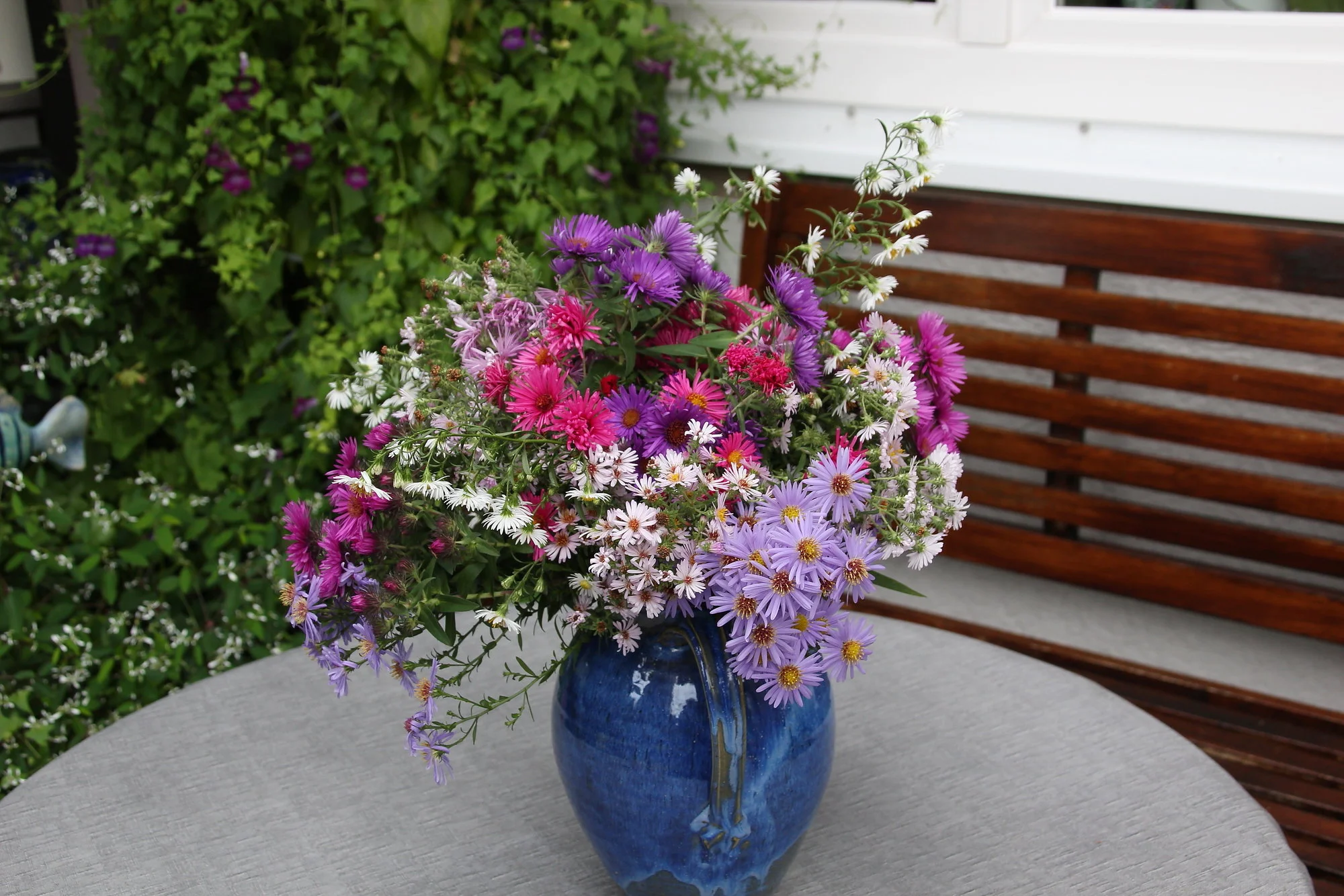 • Im Sommer schneide ich mir ja selten einen Blumenstrauß ab vom Garten. Aber heute bei den Astern bin ich schwach geworden. Es sind aber noch gar nicht alle Sorten, etliche sind schon nicht mehr so schön.