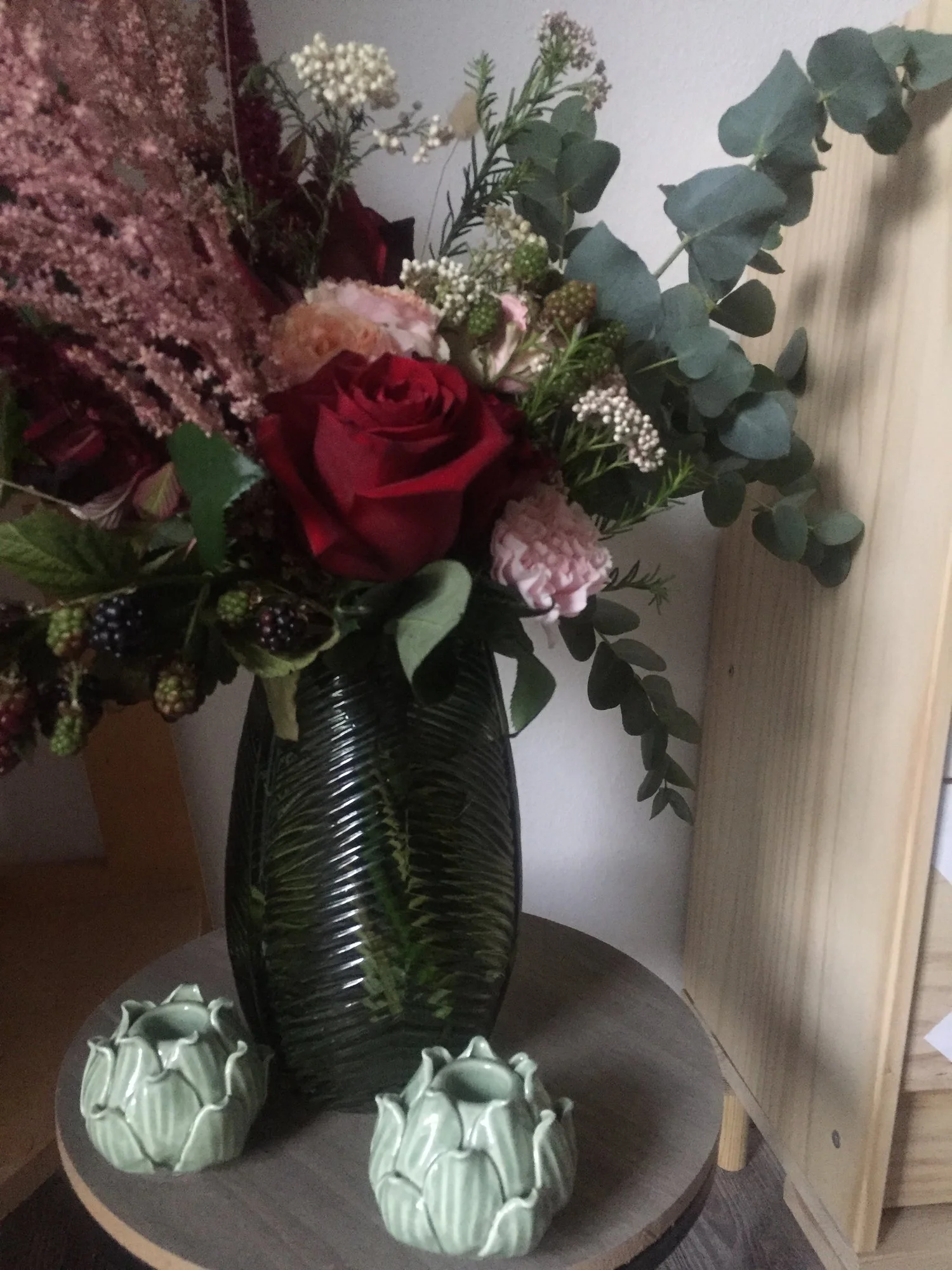 Das ist jetzt einige Woche her, noch im frischen Zustand. Der steht auch jetzt noch in einer Dunkeln Ecke, die mir zu leer war. Das waren tolle Rosen, die haben sogar geduftet.