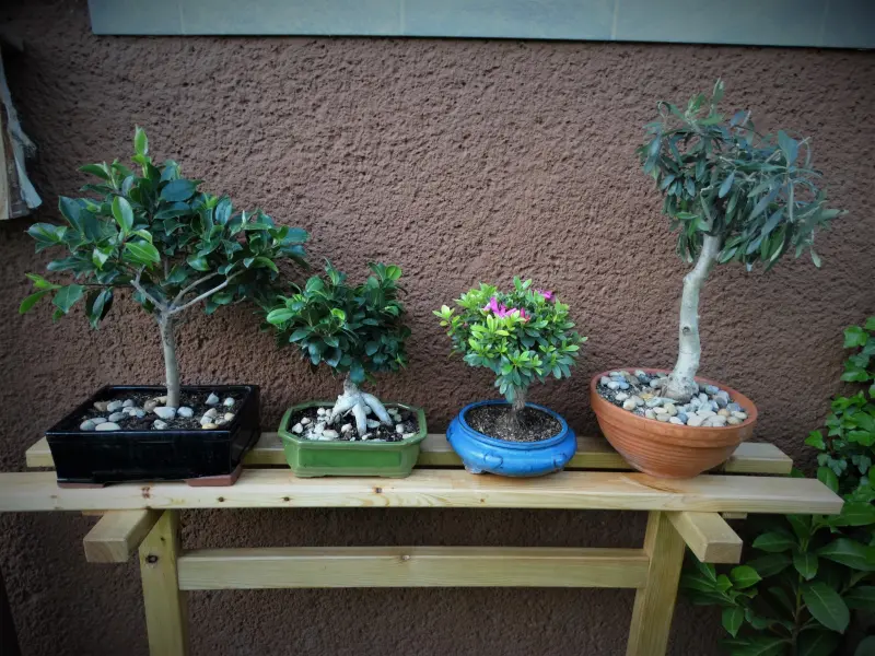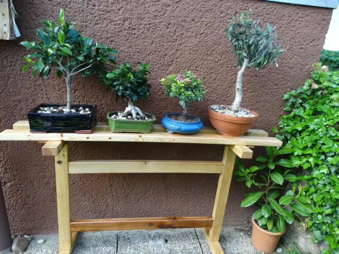 • Mein Mann hat mir gestern ein Bonsai Bankerl gezimmert, heute haben wir sie rausgestellt und die Bosai´s drauf platziert -