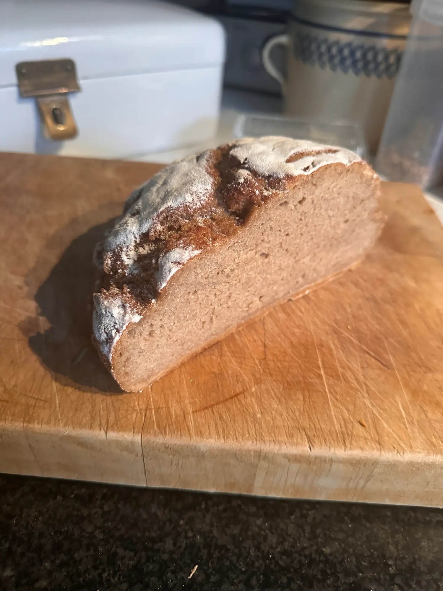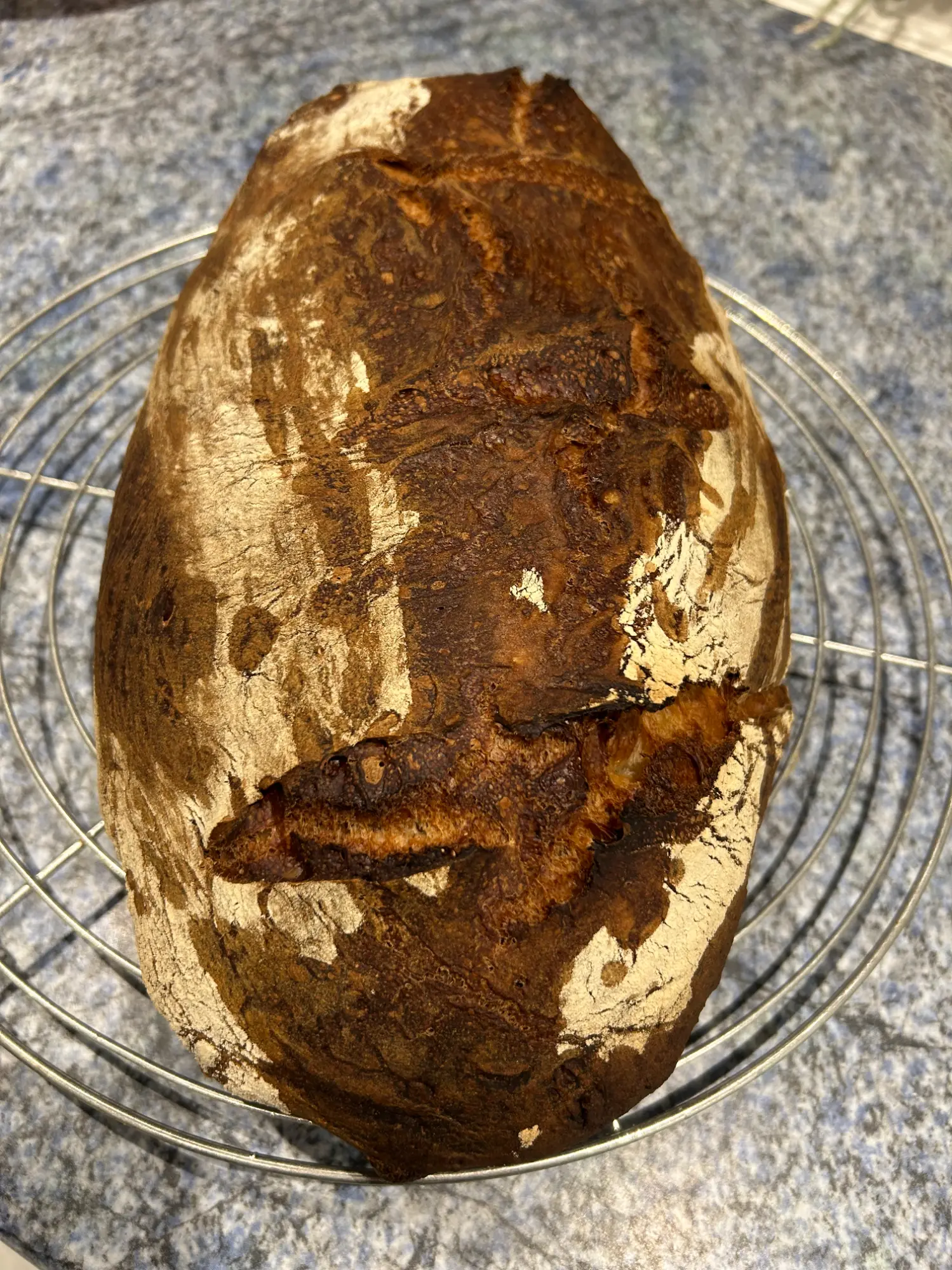 So, hier ist es nun das noch halb vorhandene Brot mit Gerstenmehlanteil. Der Teig war sehr fluffig und ließ sich auseinanderupfen- da merkt man, dass Gerste fast kein Klebereiweiß enthält. Das Brot ist ansonsten gut geworden und ließ sich auch gut formen- allerdings fehlt es an Aroma finde ich. Werd ich nicht nochmal backen.