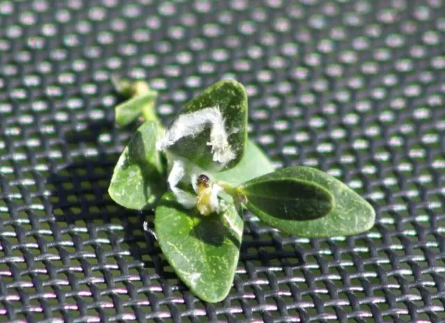 Die Gespinste sind auch noch soooo klein, kaum zu entdecken, aber überall wo 2 Blätter zusammenkleben kann man ein solches Gespinst entdecken. So werden sie leider den Winter gut überstehen, da dort auch kein Spritzmittel hin kommt.