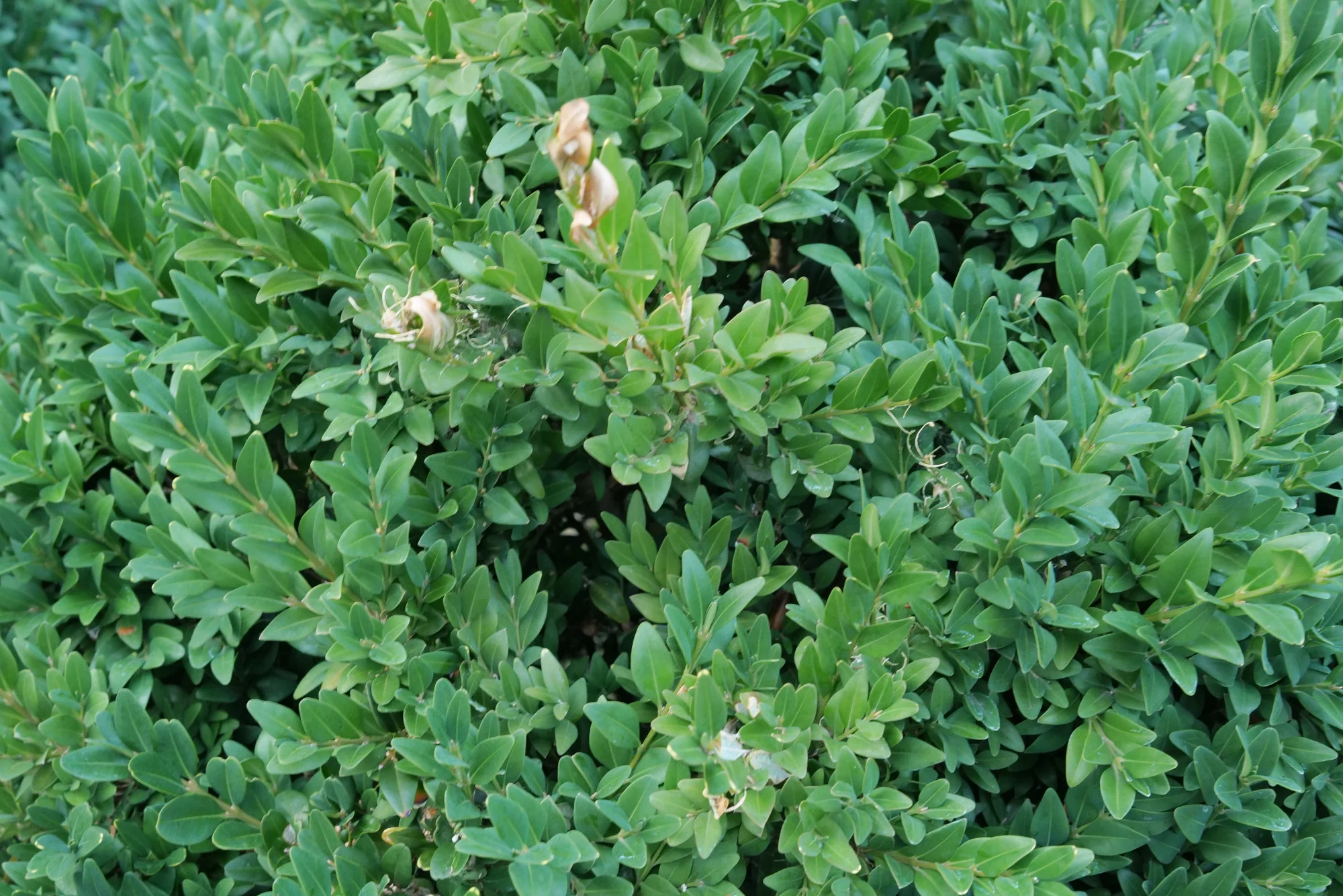 Die Leute, die ursprünglich dort gewohnt haben, haben die Hecke von ihrer Seite auch gepflegt. Jetzt wohnt dort eine Familie mit fünf Kindern. Der Familie ist es egal , ob die Hecken befallen sind oder nicht. Mein Mann hat mit dem Eigentümer des Hauses ausgehandelt, dass er auf das Grundstück darf um die Rückseite der Hecke zu pflegen.