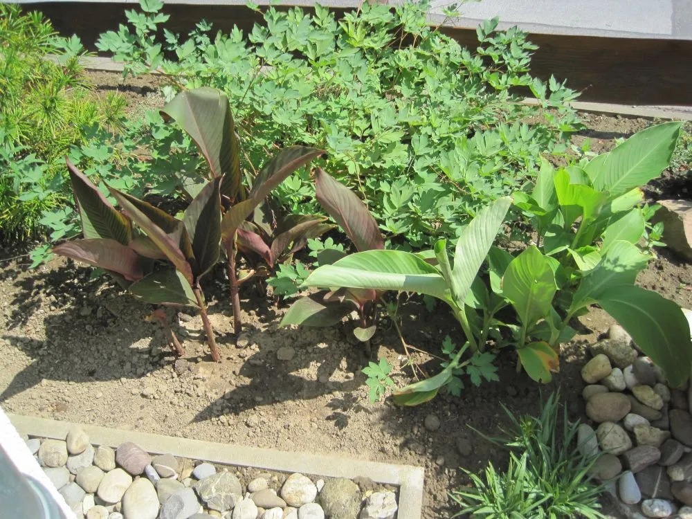 Ich hab in einer Wühlkiste für fast gratis zwei dunkle Canna-Knollen ergattert.