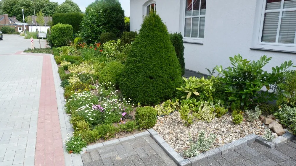 Man könnte ihn in dem Beet integrieren. Außerdem wäre mir das Beet zu ebenerdig vom Weg her. Hätt immer die Befürchtung, man würde unbedacht in die Pflanzen treten. Dafür würde ich eine Beeteinfassung zur Straße zu bevorzugen. Vor der Konifere könnte man einen solarbetriebenen Strahler installieren, der abends die Zuckerhutfichte, oder was immer das ist, anstrahlt.