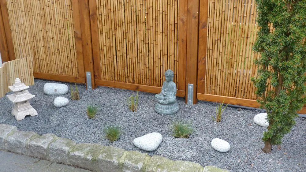 Das Beet hinter dem Zaunsfeld könnte vielleicht ein Steingarten, möglich wären auch Tröge für die Pflanzen, die man da einfach aufstellt, werden.