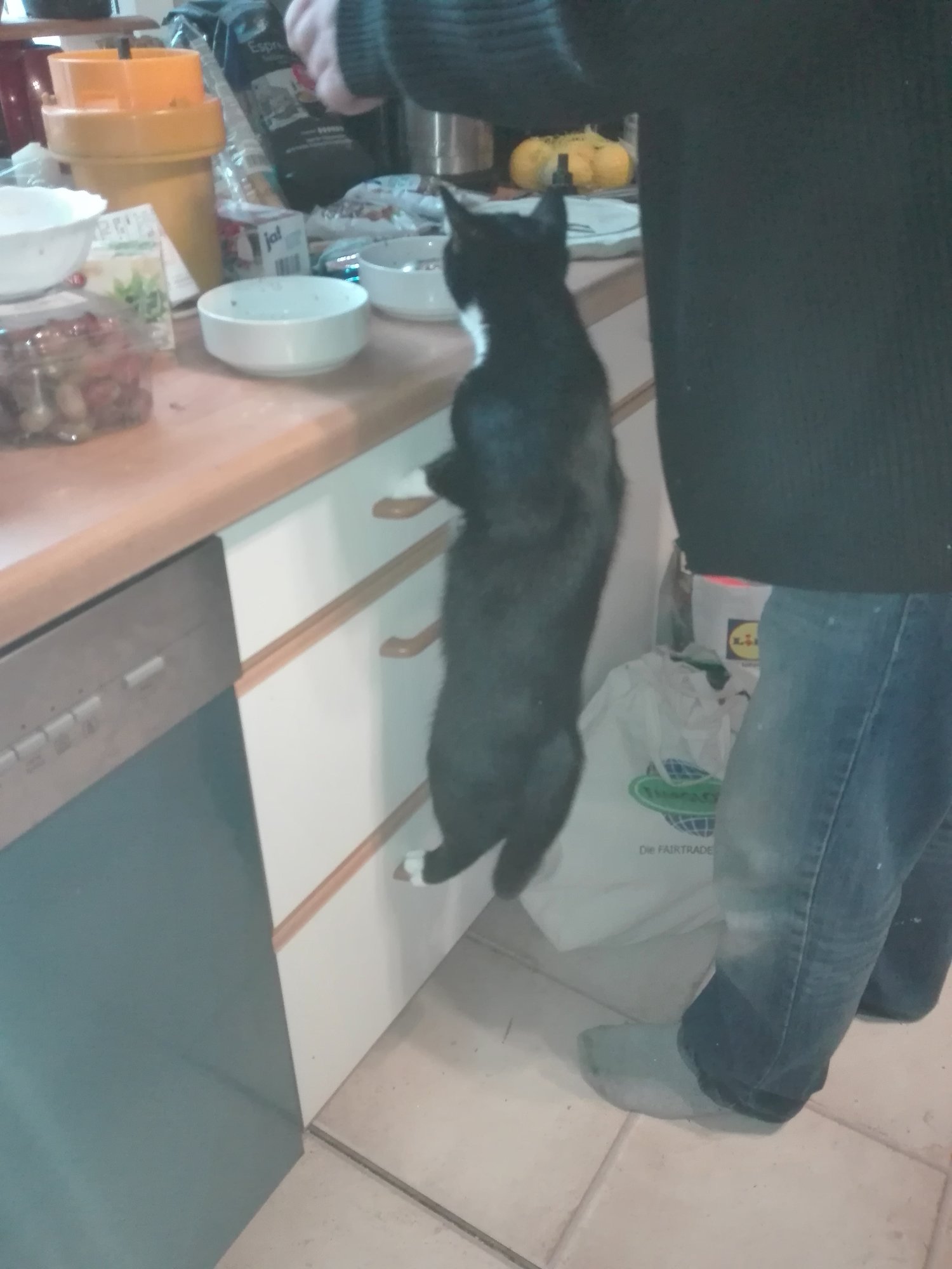 Wenn ich sie erbost und schimpfend abschüttle, ist sie beleidigt und jault auf dem Bodn weiter. So ein verfressenes Viech wie die hatten wir noch nie. Sie ist auch die einzige, die klaut. Ach, was waren das für ruhige Zeiten, als alle unsere Katzen wussten, dass sie nicht klauen dürfen. Ich muss jetzt sogar die Brötchen fürs Mittagessen im Backofen verstecken. Lege ich sie nämlich zum Auftauen auf das Brotbrett, sind sie immer angefressen.