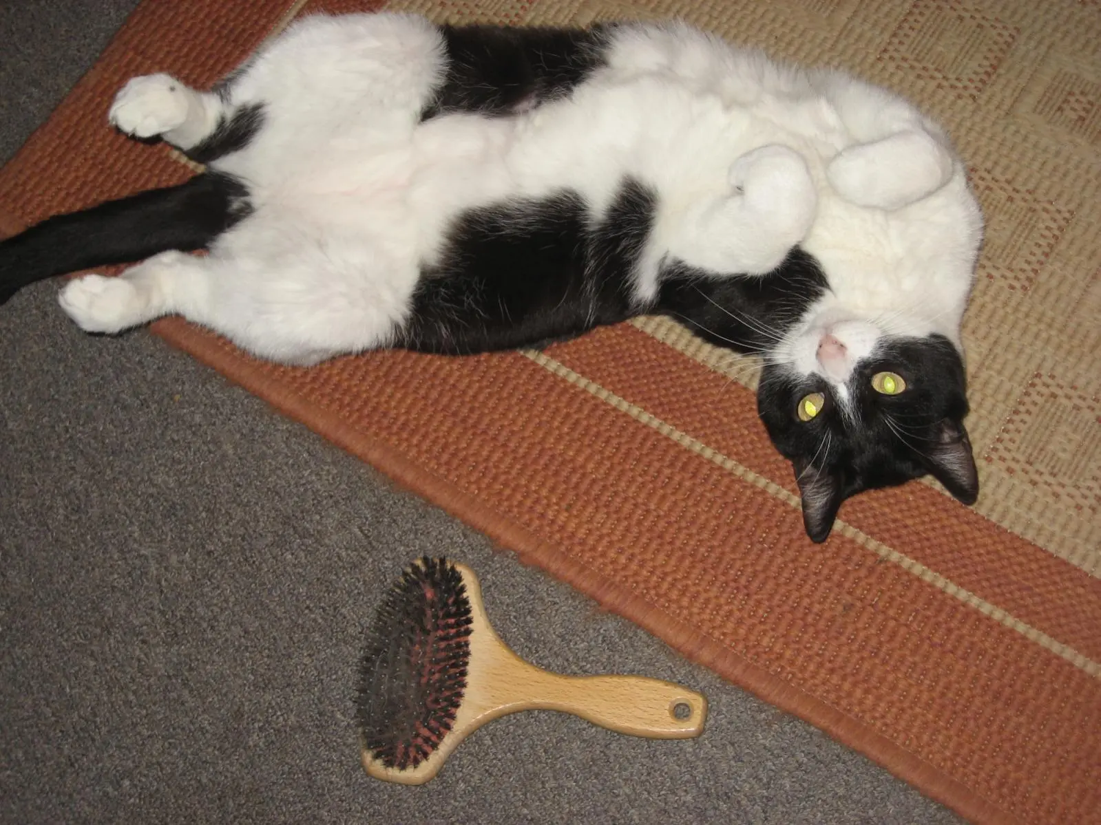 Früher lag Lucy am Aquarium,legte sich auf den Rücken und maunzte GG so lang und laut an,bis er sie bearbeitete (bei Männern hielt sie viel länger als bei mir?!).Leider hat Dosi das Aquarium hergeschenkt....Und so legt sie sich halt auf den Boden ,aber deutlich unbequemer für den Bürster..lol