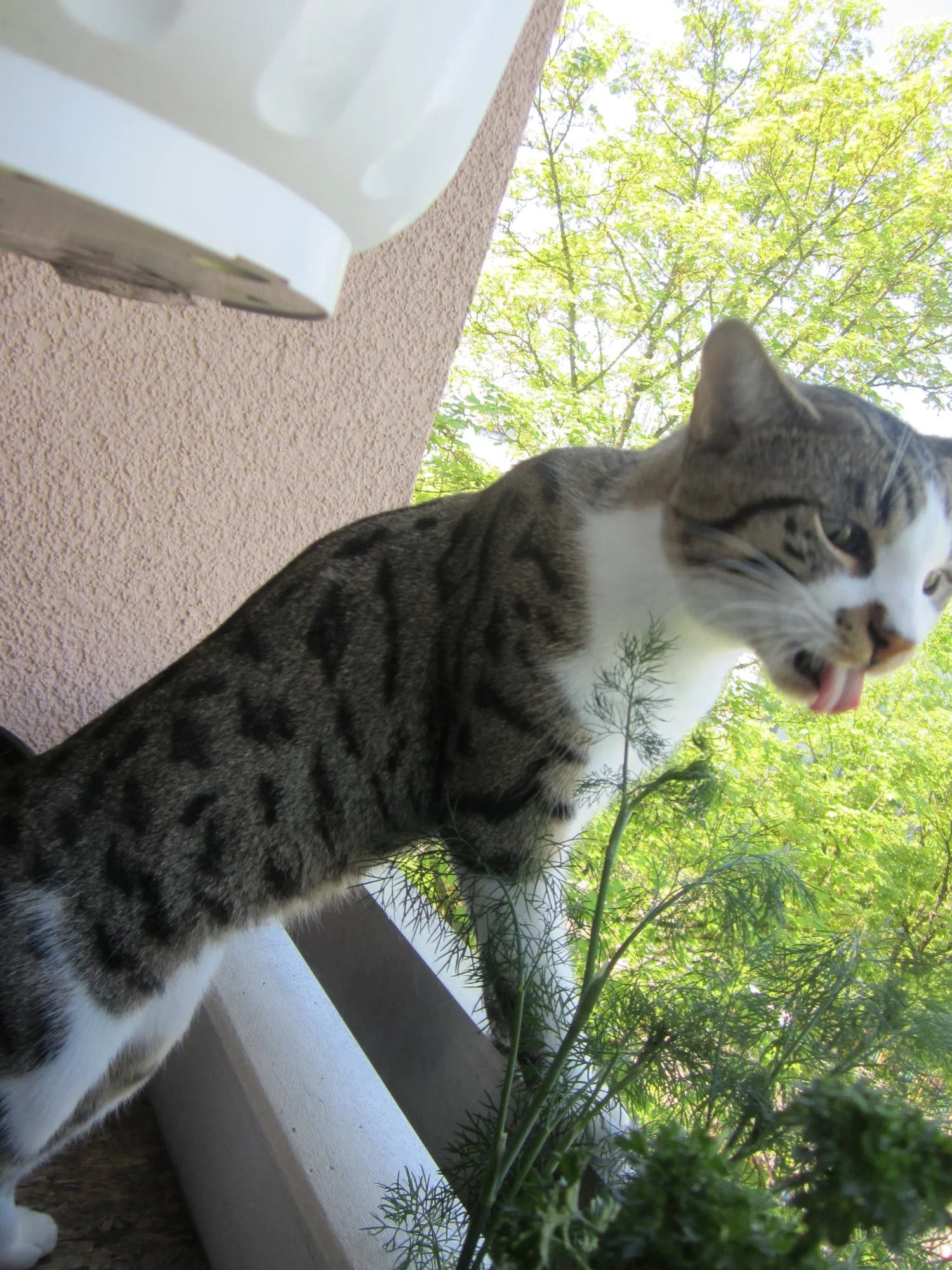 Cookie und Ihre Schwester waren aber schon als junge Katzen gerne auf dem Balkon gesessen und haben die Passanten gestalkt, allerdings nicht vom Geländer aus sondern unter dem Geländer unten durch geguckt.