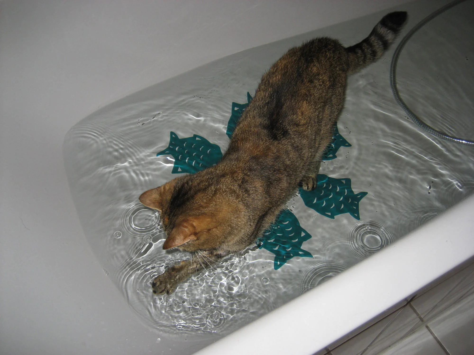 • So was habe ich ja noch nie gesehen, eine Katze freiwillig im Wasser. Ich kann mir nur vorstellen, das sie es von klein an gewöhnt sein müssen, oder ? Mein Rudi schaut immer ganz suspekt, wenn ich in der Badewanne sitze und der Schaum um mich rum ist. Da ist er mal auf den Wannenrand gekommen, aber nur einmal, jetzt schaut er von weiten hin.